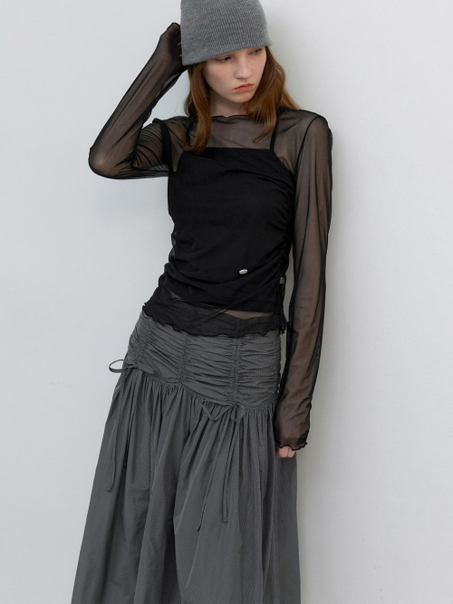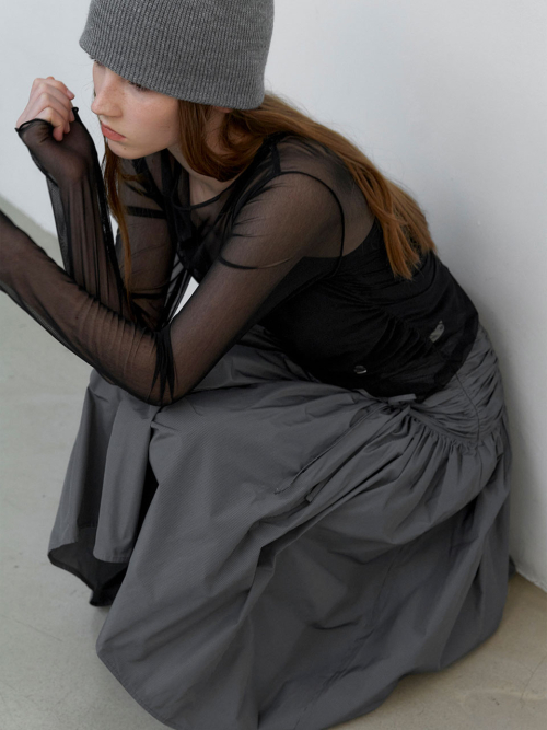 허리 셔링과 사이드의 직선형 터널 디테일이 입체감을 더해 치마의 볼륨을 살려주며,