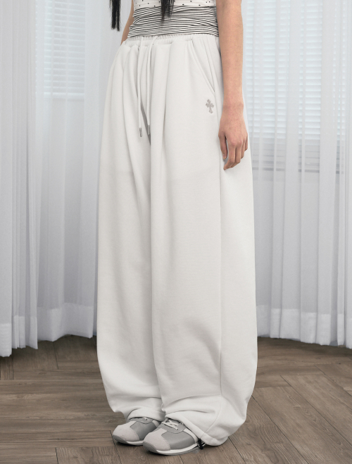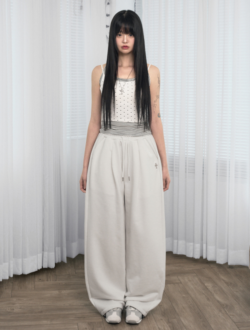 크로스 자수 밴딩 핀턱 와이드 롱팬츠 아이보리