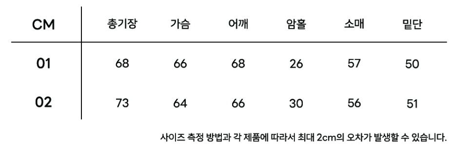 -01, 02 사이즈 두 가지로 준비되어있습니다. 오버핏으로 77까지 넉넉히 착용가능하며, 남자의 경우 95까지 가능합니다.