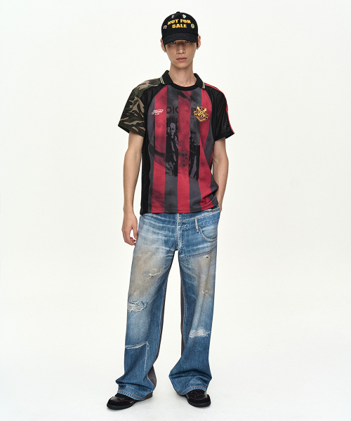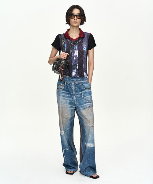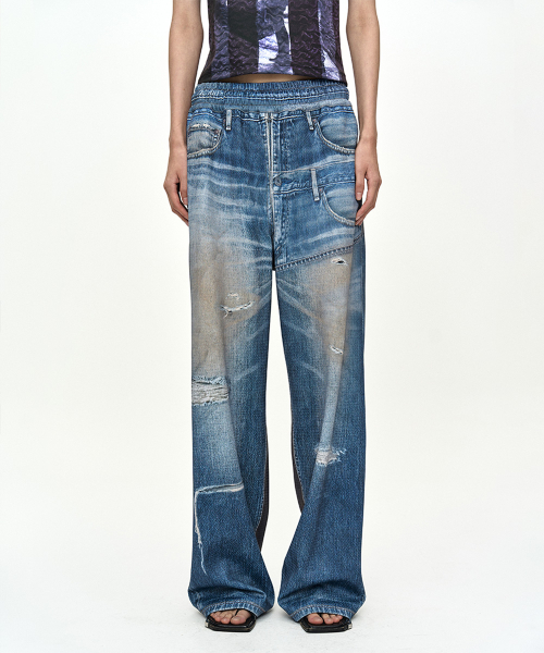 UNISEX ASYMMETRIC LAYERED HOT-FIX WIDE-LEG JEANS apa912u(BLACK)