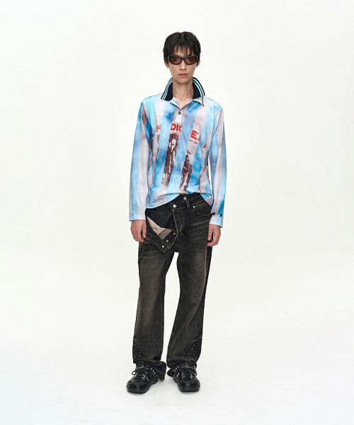 UNISEX ASYMMETRIC LAYERED HOT-FIX WIDE-LEG JEANS apa912u(BLACK)