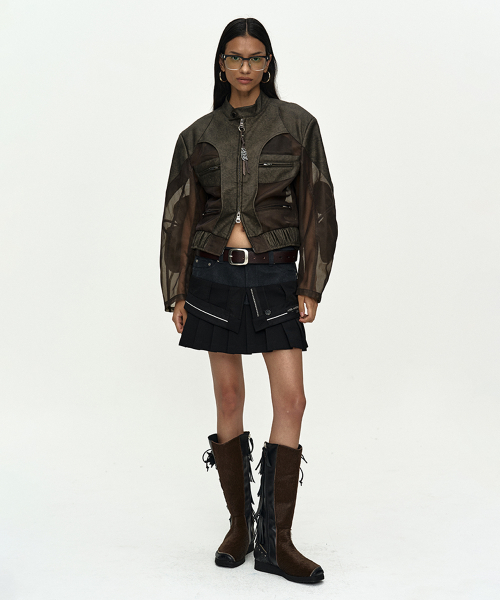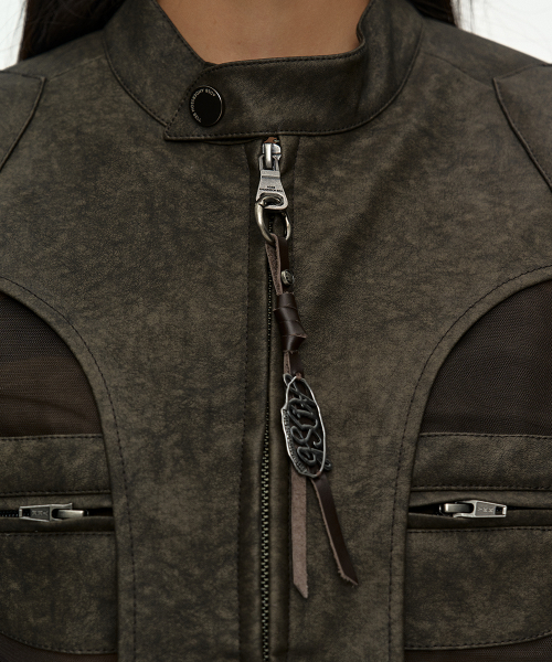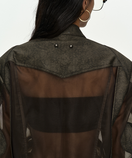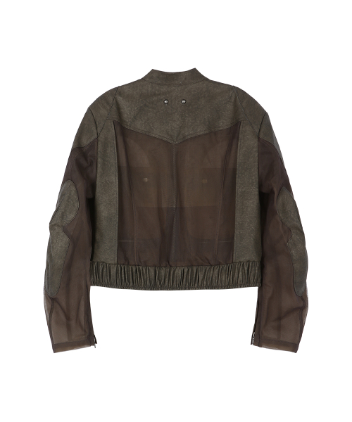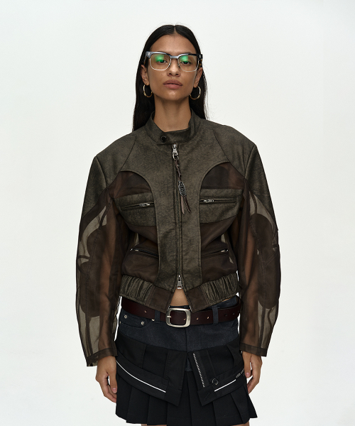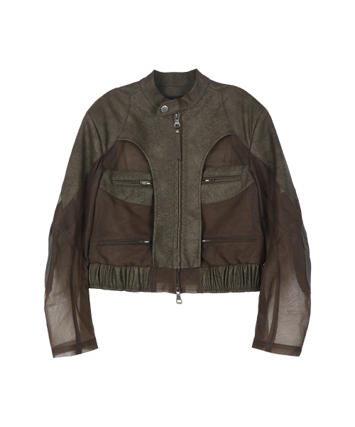 KELLY FAUX-LEATHER & SHEER RIDER JACKET awa758w(KHAKI)