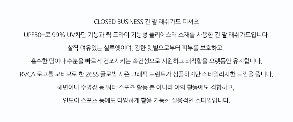 루카(RVCA)는 주짓수 아티스트 협업라인을 기반으로 한 스트릿 감성의 스포츠 캐주얼 브랜드로, 예술과 스포츠를 결합해 자유롭고 건강한 라이프스타일을 제안하는 브랜드입니다.