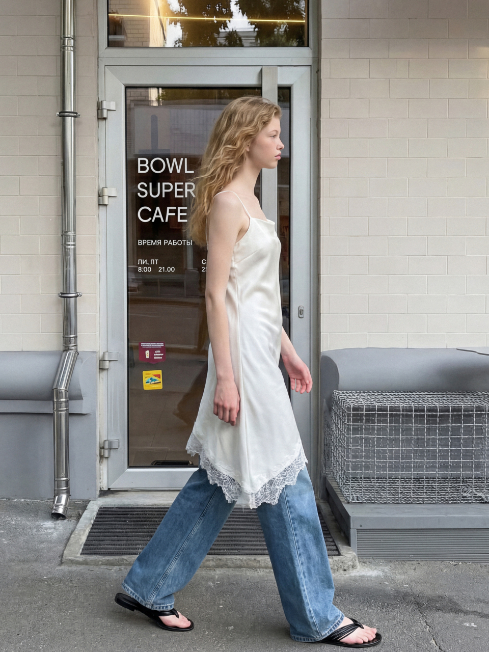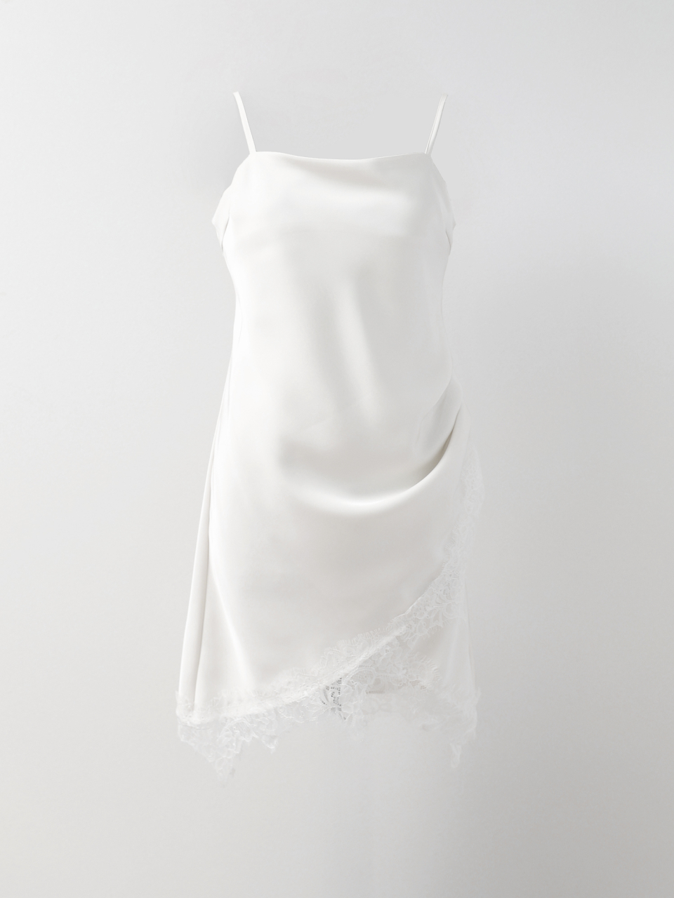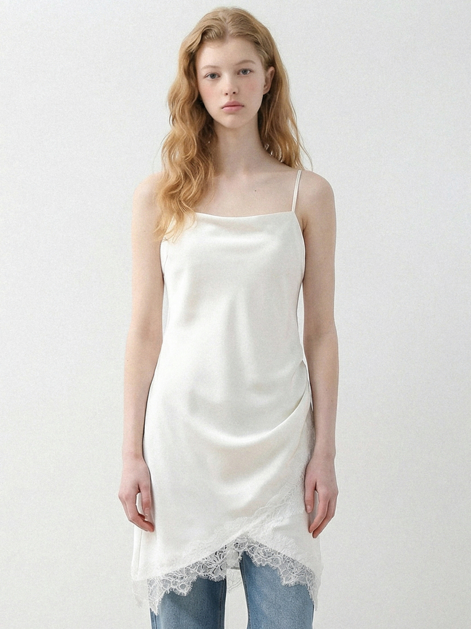 부드러운 광택감의 새틴소재에 레이스 트리밍이 여성스럽고 트렌드한 무드의 슬립 드레스입니다.