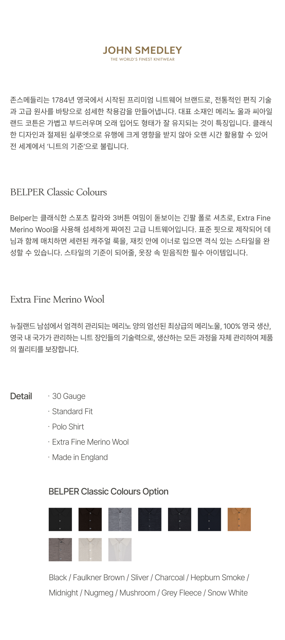 존 스메들리(JOHN SMEDLEY)는 250여 년의 역사를 가진 명품 니트 브랜드로, 전 세계에서 가장 얇은 니트를 선보이며 왕실 인증서를 보유하고 있습니다.
