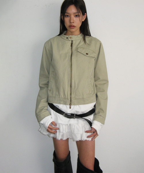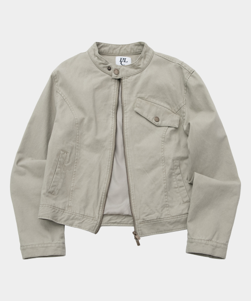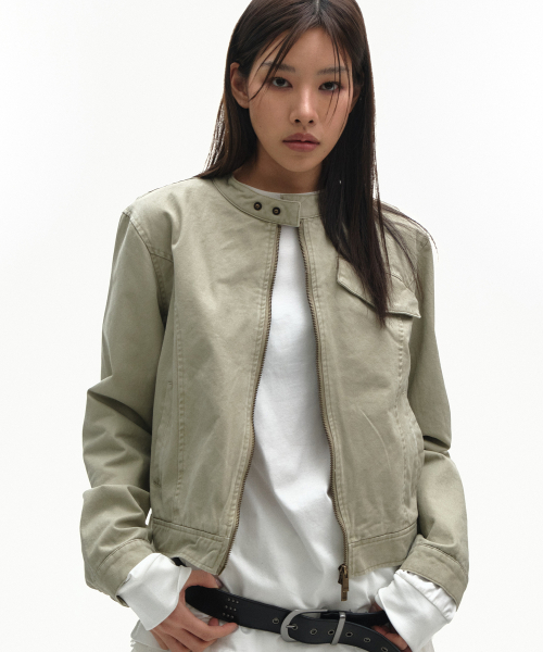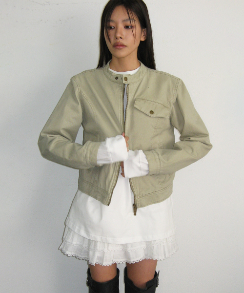 하이넥 스탠다드 스트랩 비조 포인트 블루종 집업 자켓 [베이지]