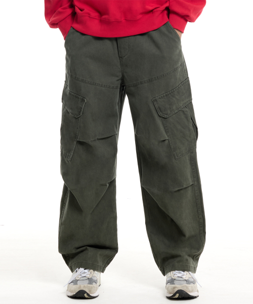 사선 절개 필드 파라슈트 카고 팬츠 카키