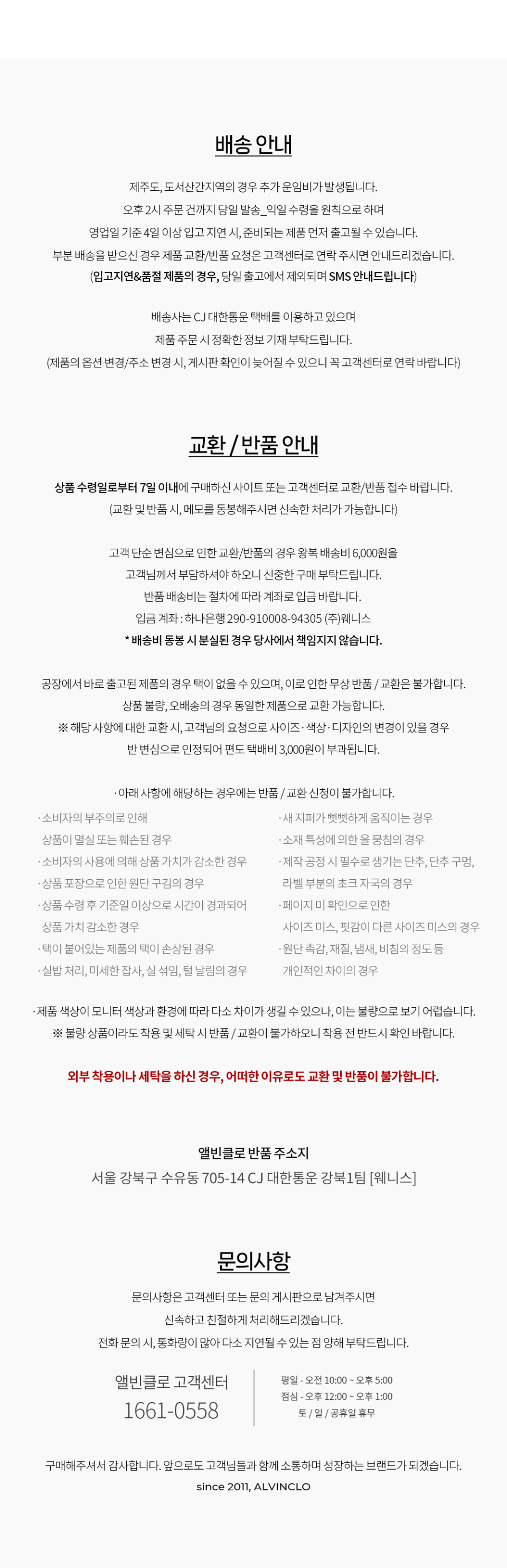 앨빈클로(ALVINCLO)는 '옷을 입는 한 사람'으로서 언제 어디서나 편안하고 트렌디한 옷을 만들기 위해 끊임없이 노력하고 성장하고자 합니다. 다양하게 변화하는 디자인 흐름 속에서 본질에 충실하면서도 유니크한 디자인을 선보입니다. 또한, 론칭 이후 지금까지 국내 원단 사용&생산을 고집하고 있으며 철저한 품질 관리를 통해 눈치채기 힘든 부분까지 디테일하게 관리합니다.
