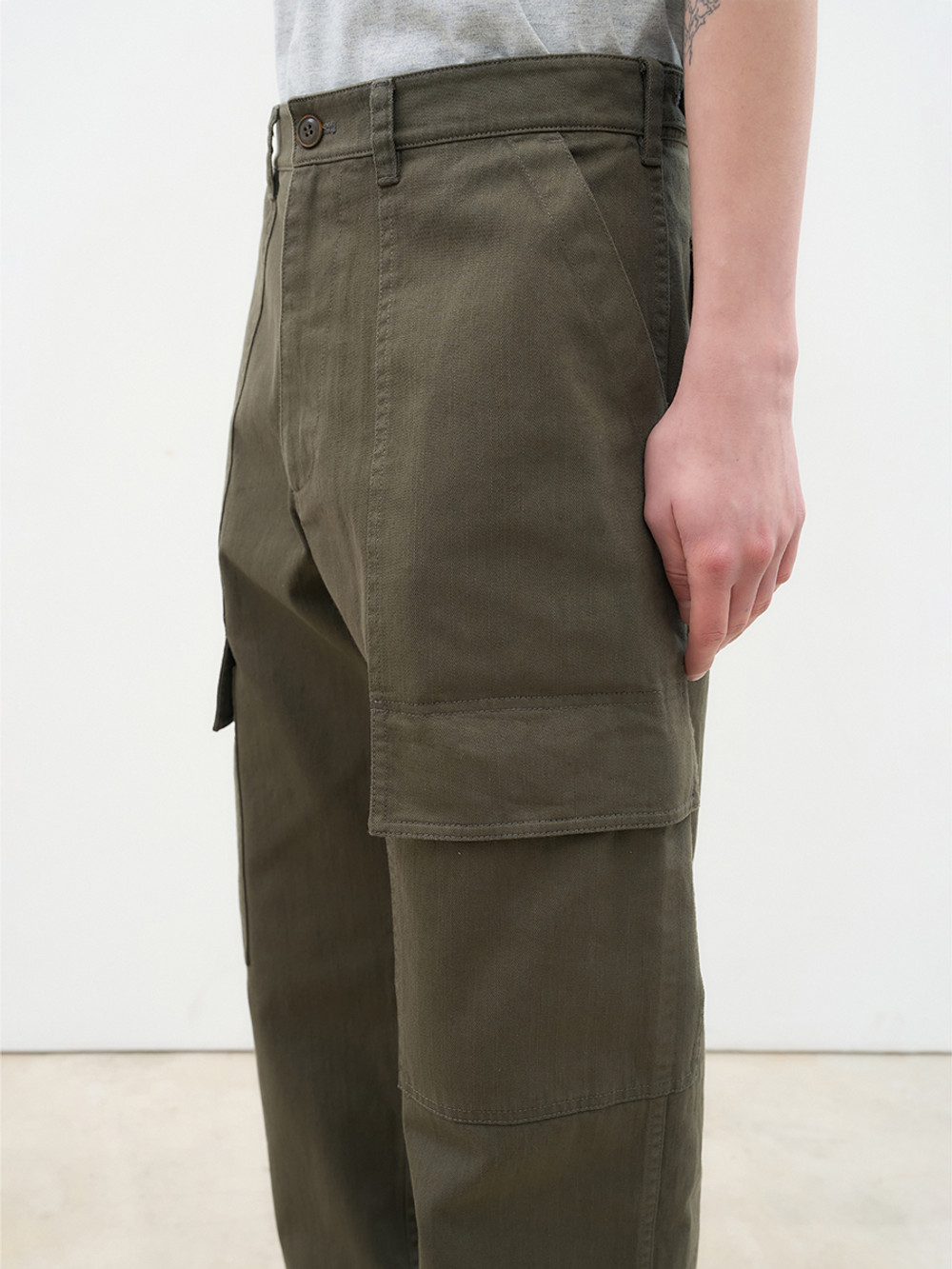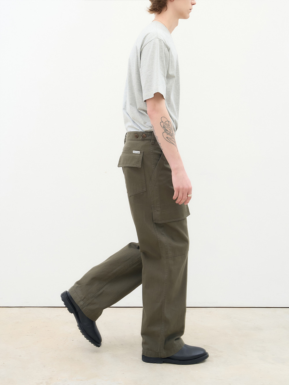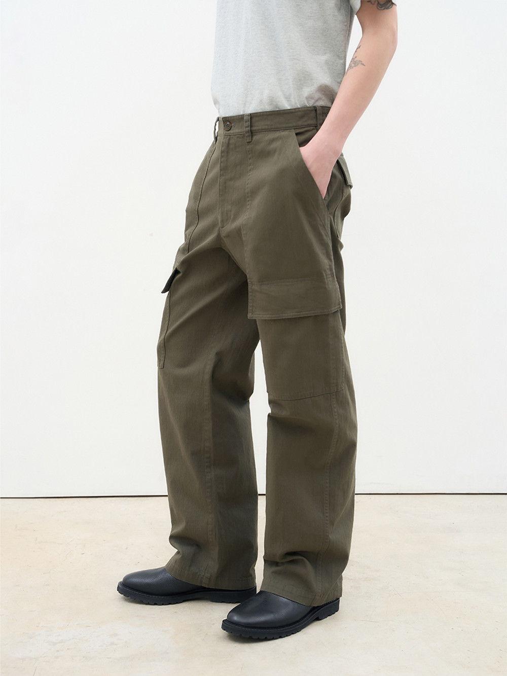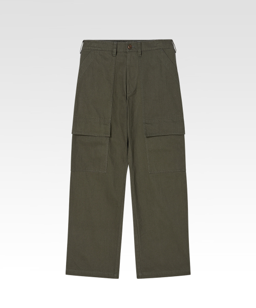 위트 있는 포켓 디테일로 분위기를 전환한 퍼티그 카고 팬츠. 은은한 요철감과 빗줄기가 흐르는 듯한 독창적인 텍스처가 살아 있는 16수 슬럽 트윌 코튼 소재. 이중으로 설계된 퍼티그 포켓 구성으로 실용성과 위트를 동시에 강조한 정교한 디테일. 레귤러 핏과 자연스러운 워싱이 어우러져 다양한 스타일에 유연하게 매칭되는 입체적인 실루엣. 밀리터리의 본질적인 아카이브를 현대적인 감성으로 재해석한 아이템.