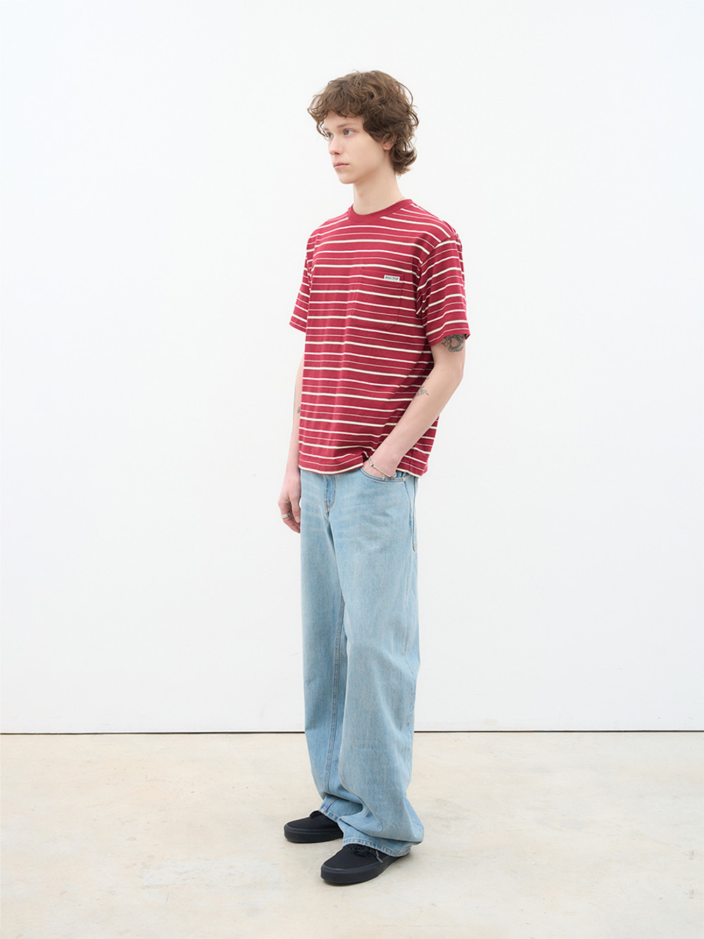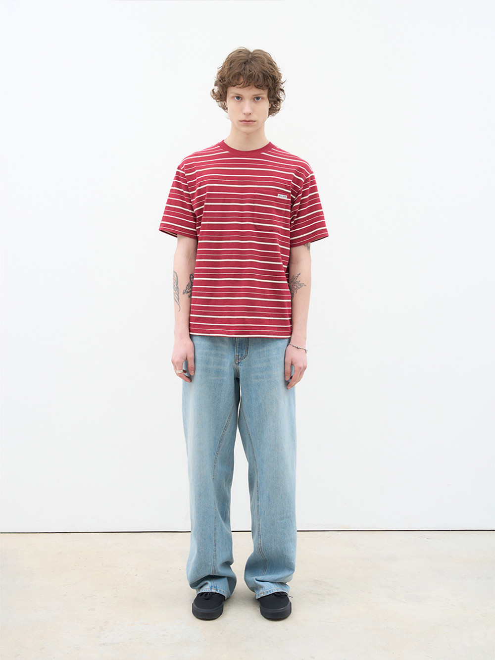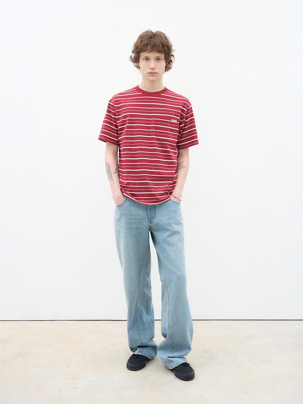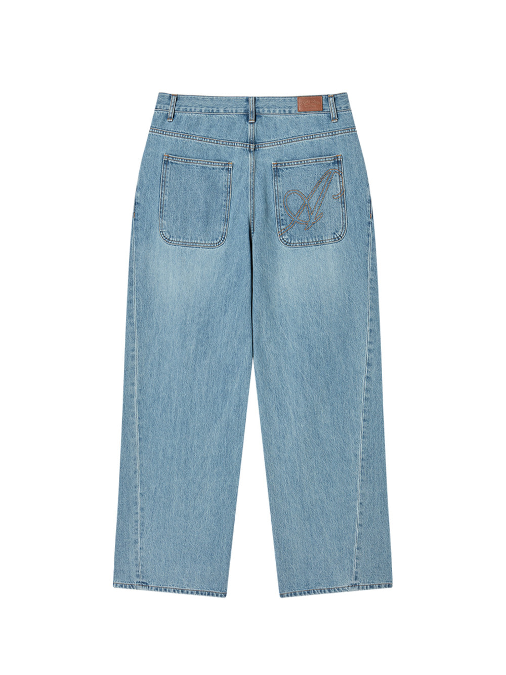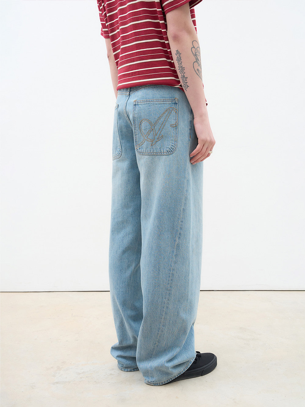 새롭게 선보이는 트위스트 데님 진스. ARTISTIC MILL(ADM)사에서 정교하게 재직한 12.5oz 프리미엄 데님을 채택하여 구현한 탄탄한 밀도와 깊이 있는 텍스처의 정수. 머서라이즈(Mercerization) 공정을 거쳐 불순물을 정제하고 완성한 투명하고 맑은 텍스처. 인심과 아웃심이 유연하게 회전하는 트위스트 절개 라인을 따라 흐르는 입체적이고 전위적인 실루엣. 정교한 스톤 워싱으로 구현한 깊이 있는 볼륨과 데님 본연의 자연스러운 페이스. 뒷 포켓에 섬세하게 새긴 AP 심볼 스티치 디테일로 완성한 브랜드의 독보적인 아이덴티티. 균형 잡힌 와이드 핏과 견고한 소재감이 조화를 이룬 현대적 감각의 마스터피스.