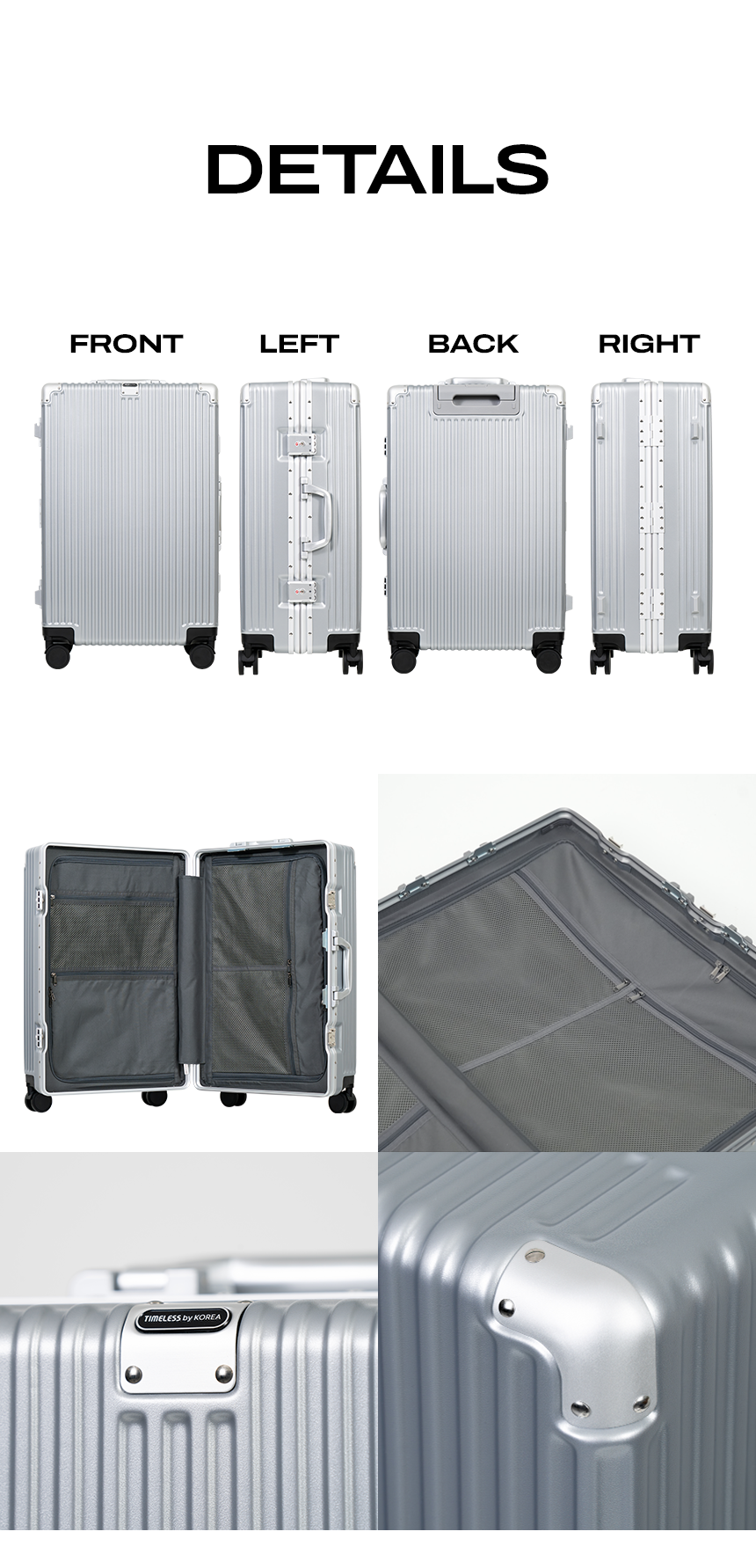 타임리스(TIMELESS)는 세계 최초 7cm 교체형 더블 휠을 자체 개발하여 여행 중 겪을 수 있는 불편함을 편리함으로 바꾸는 여행용 캐리어 브랜드입니다.