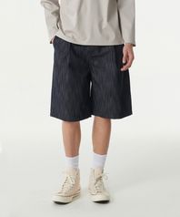 버티컬 슬러브 원 턱 와이드 데님 쇼츠 [다크 인디고]