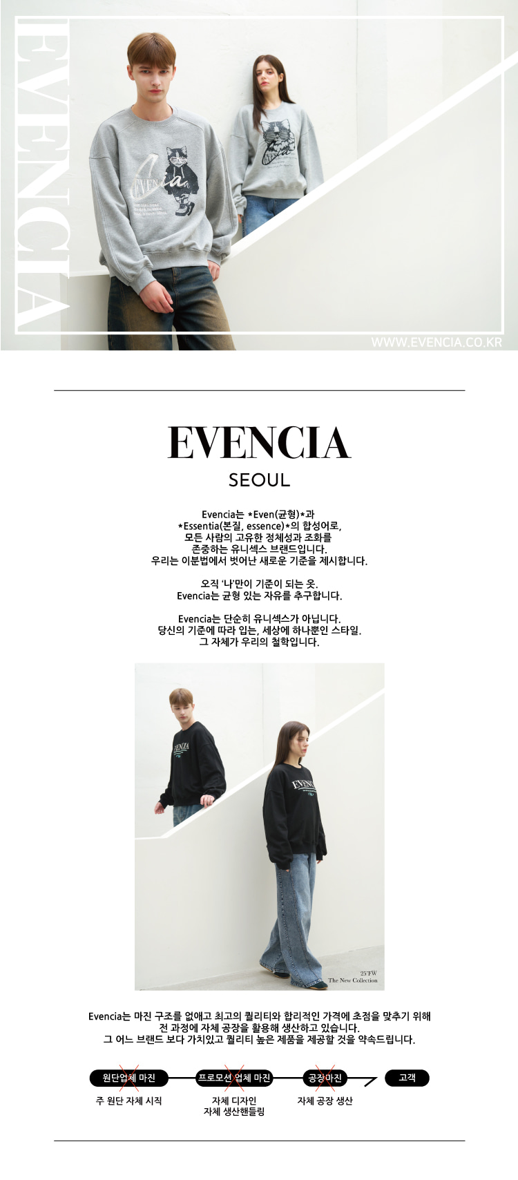 이븐시아(EVENCIA)는 균형과 본질의 가치를 바탕으로 고유한 정체성과 조화를 존중하는 유니섹스 캐주얼을 전개하며, 원단과 봉제 전반의 자체 생산을 통해 높은 완성도와 개성 있는 디자인을 선보이는 브랜드입니다.