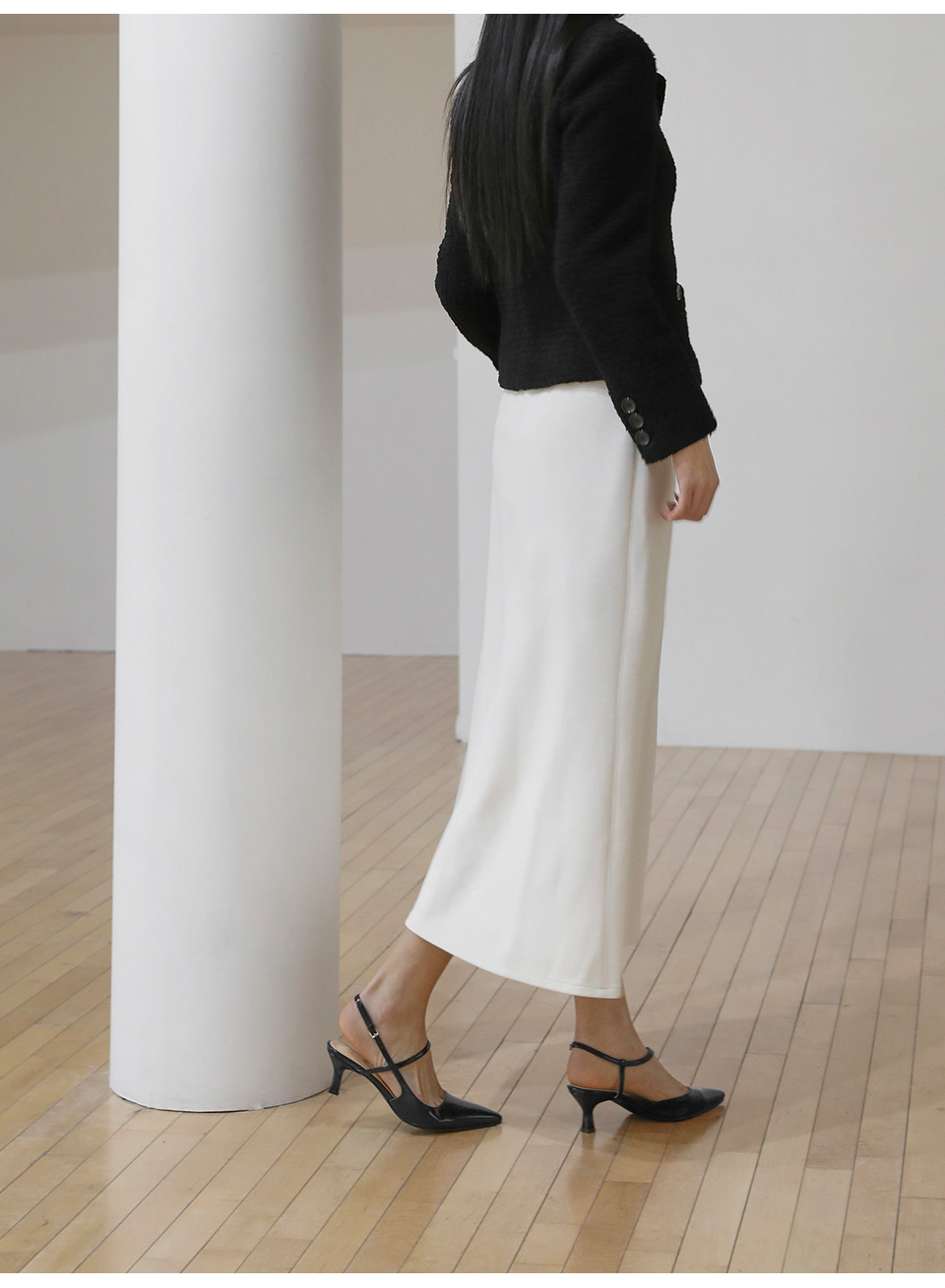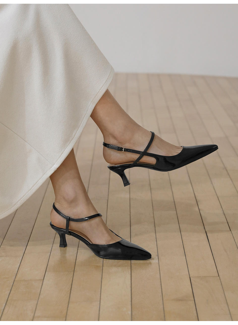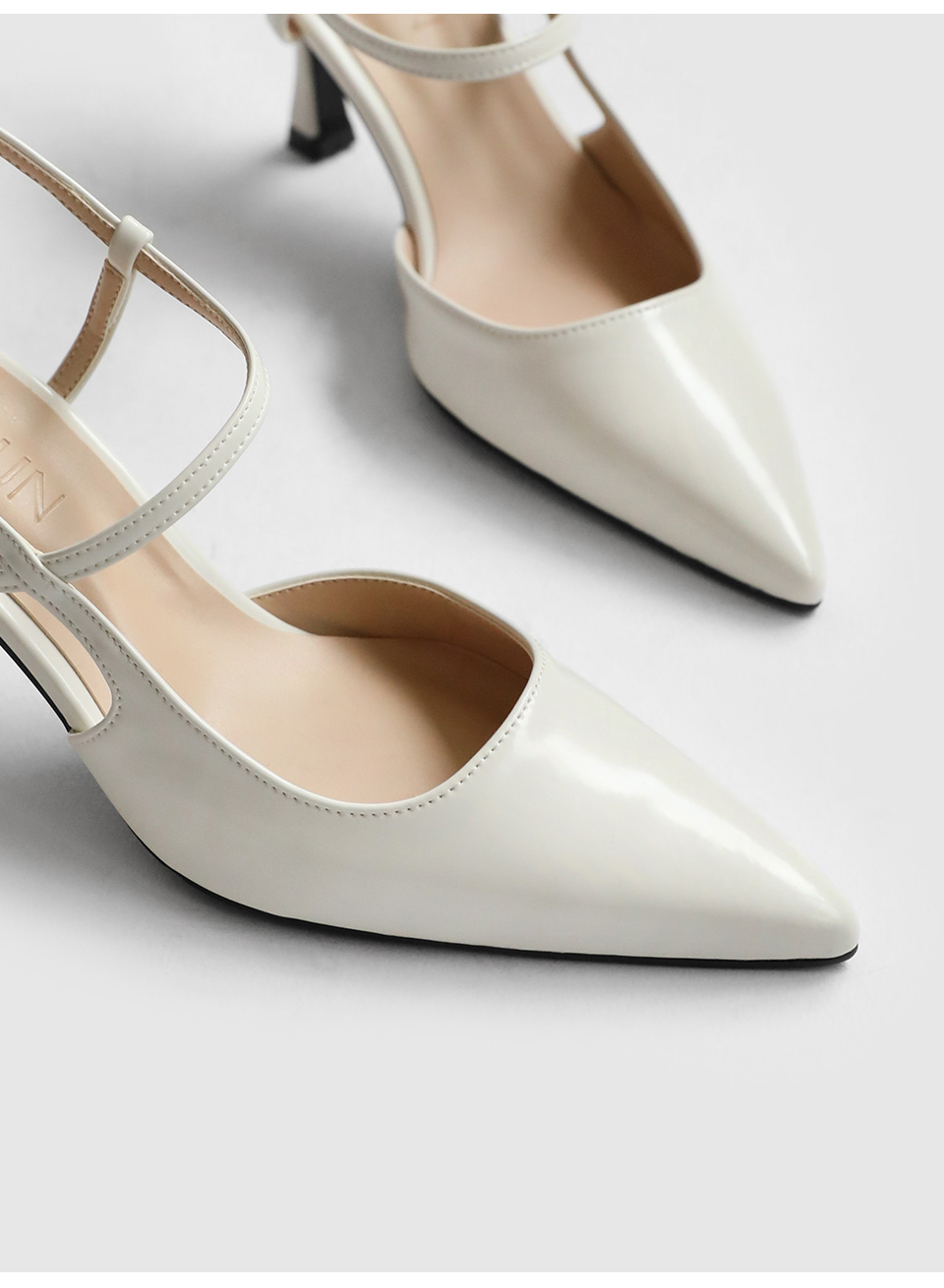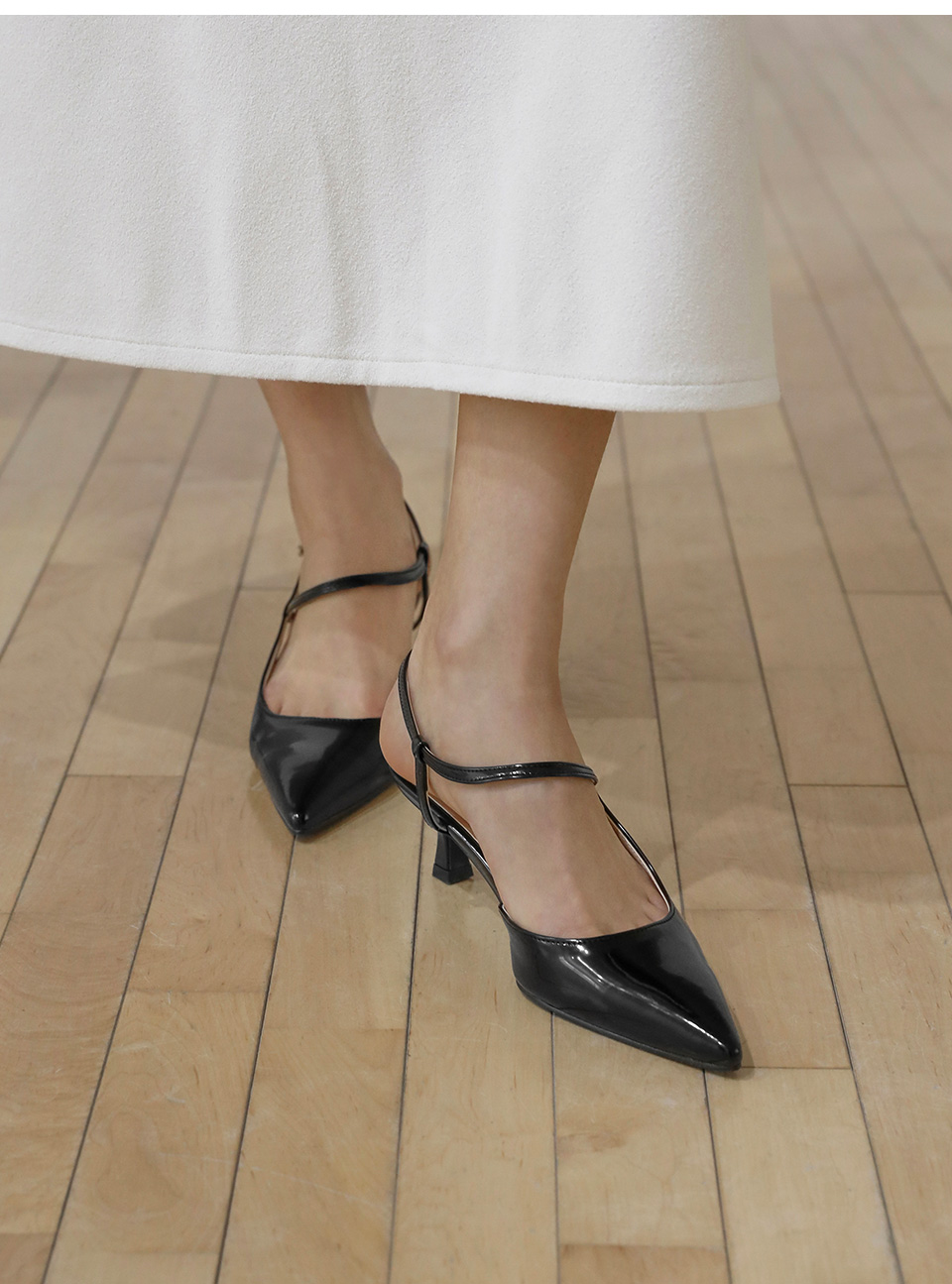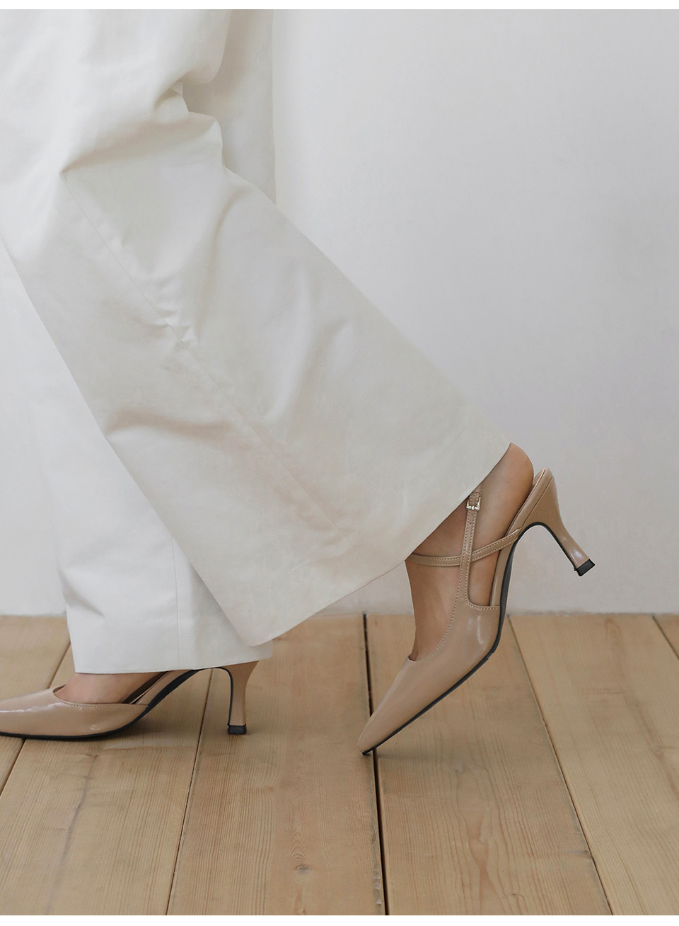 · 세련된 포인티드 쉐입으로 매력적인 무드의 슬링백힐입니다.