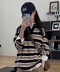 (우먼) 스트라이프 카라 니트-다크 네이비