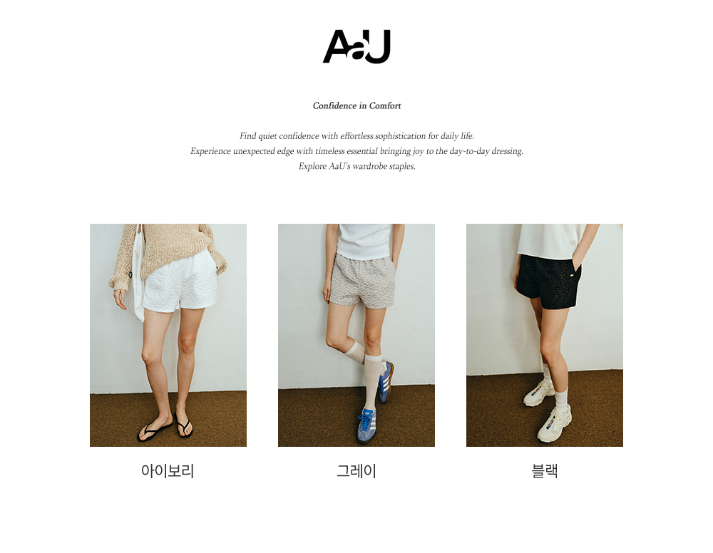 에이에이유(AAU)는 당신의 모든 것을 위한, 당신에게 집중하는 브랜드로 내 몸에 맞춘 듯한 편안함과 격식에 구애받지 않는 데일리 아이템으로 일상에 한 포인트의 멋을 더하는 브랜드입니다.