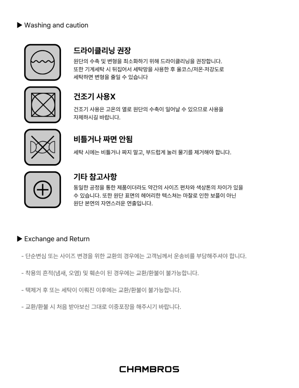 챔브로스(CHAMBROS)는 Chae Ambitious Brothers 약자의 합성어로 답답한 도시의 틀 속에서 벗어나 열정적인 생각과 감정을 갖고 챔브로스 만의 감성을 통해 각자의 자유와 개성을 표현할 수 있도록 고민하고 구현하는 스트릿 캐주얼 브랜드입니다.