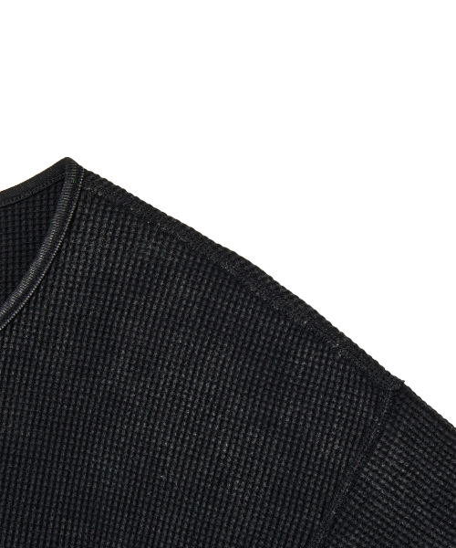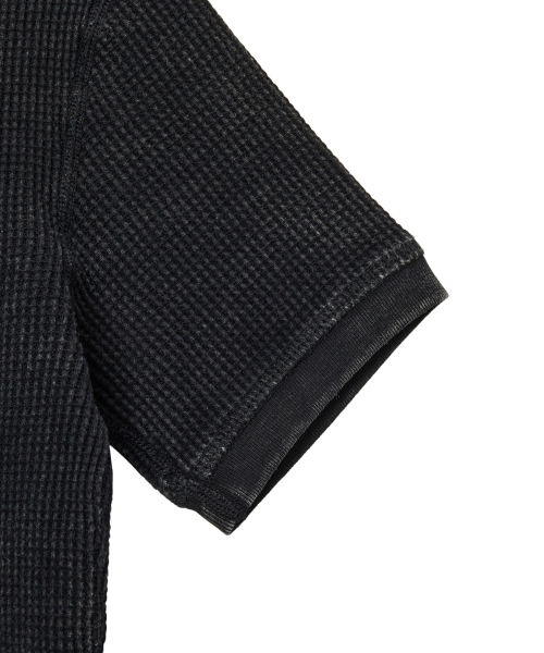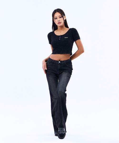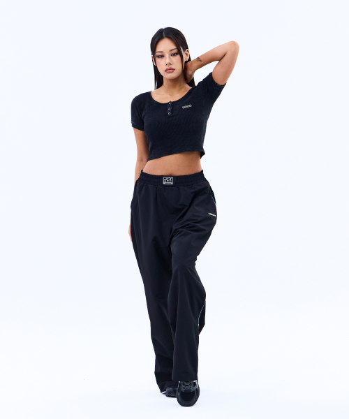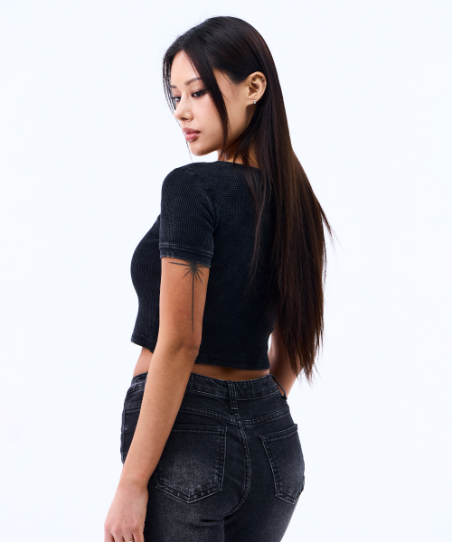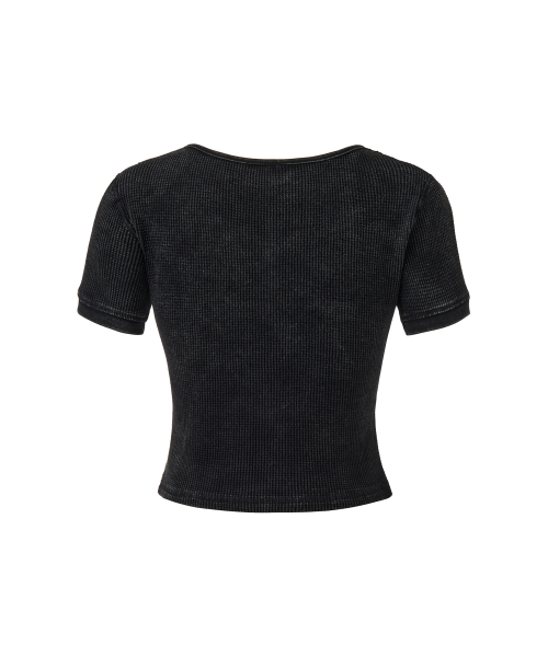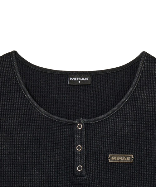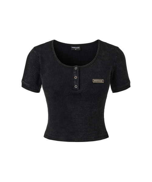 메탈 라벨 워시드 와플 헨리넥 크롭 티셔츠 (BLACK)