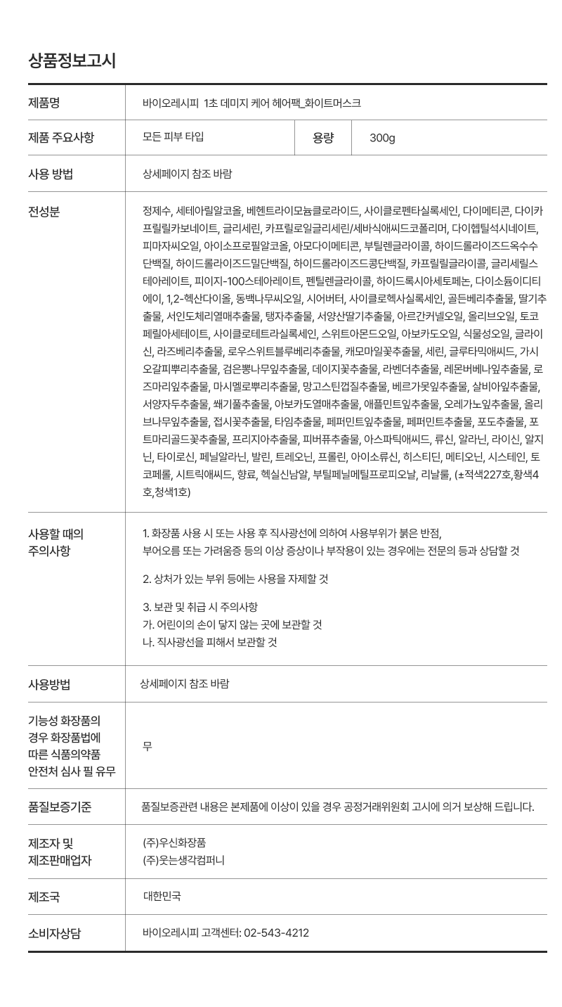 [2개] 바이오레시피 1초 데미지케어 헤어팩 300g/ 손상모복구 LPP 트리트먼트 단백질 헤어클리닉