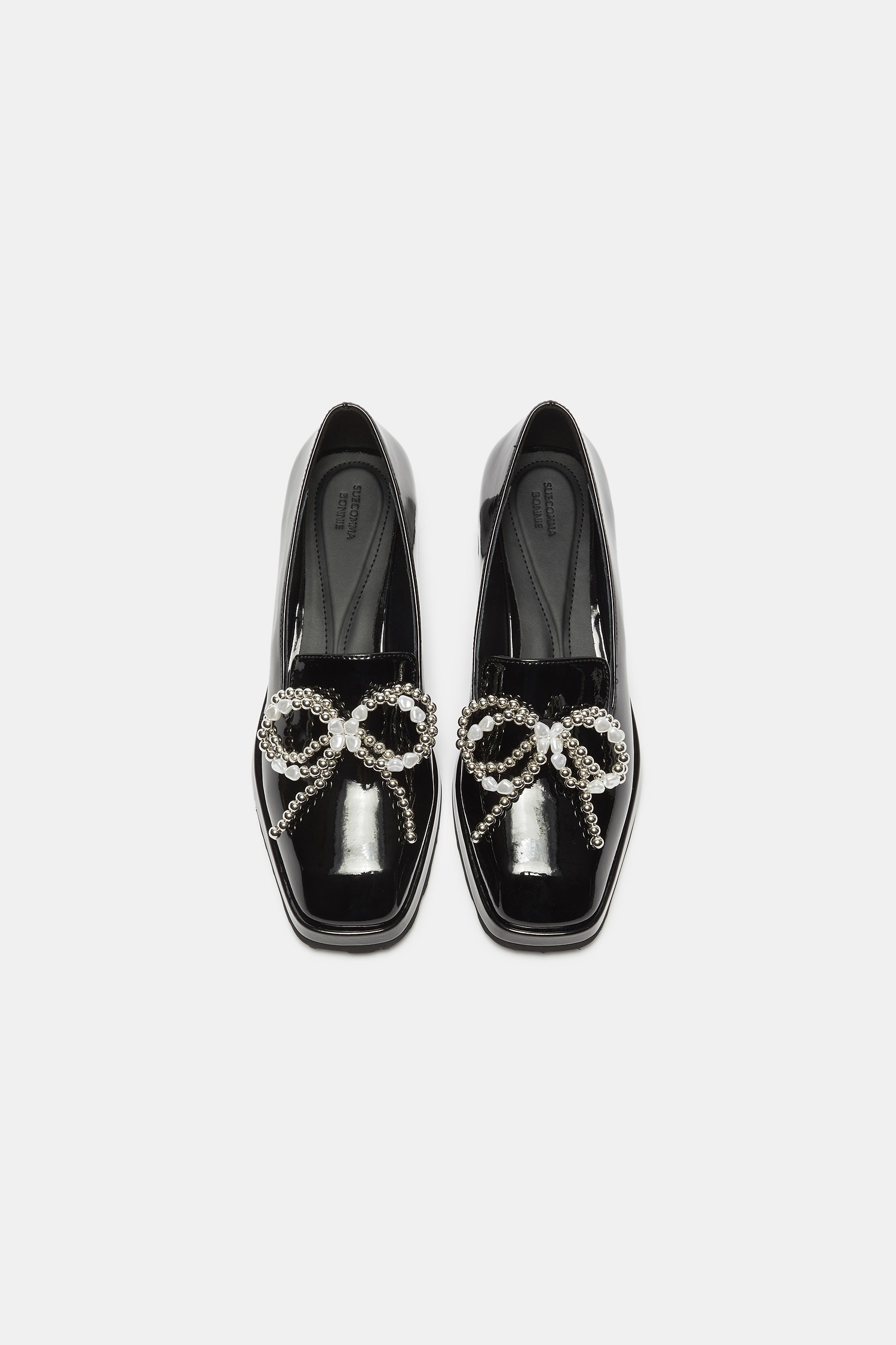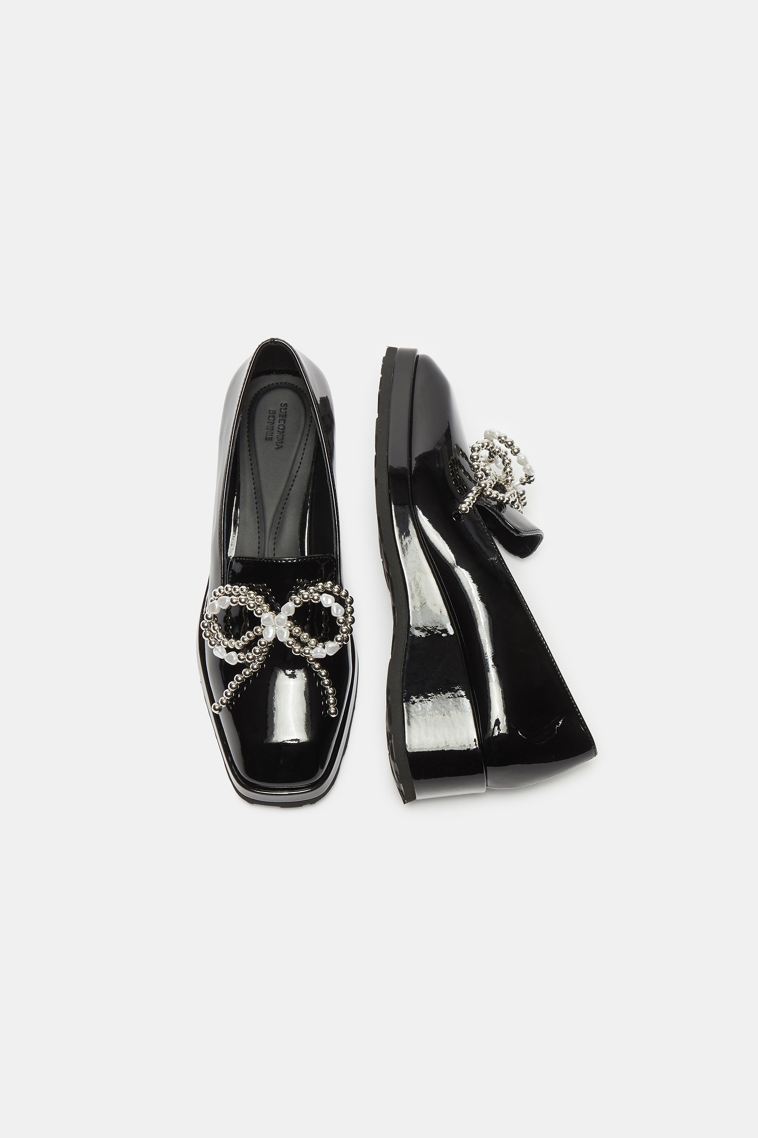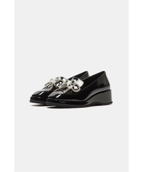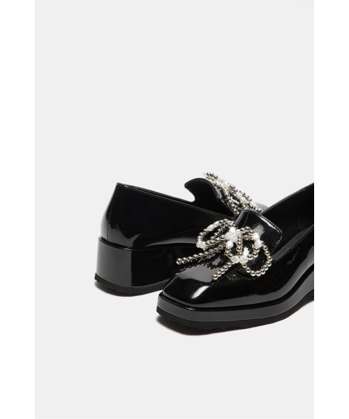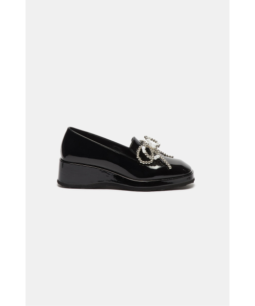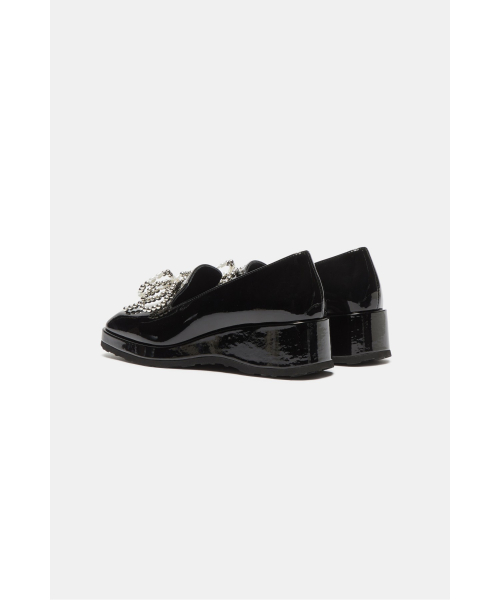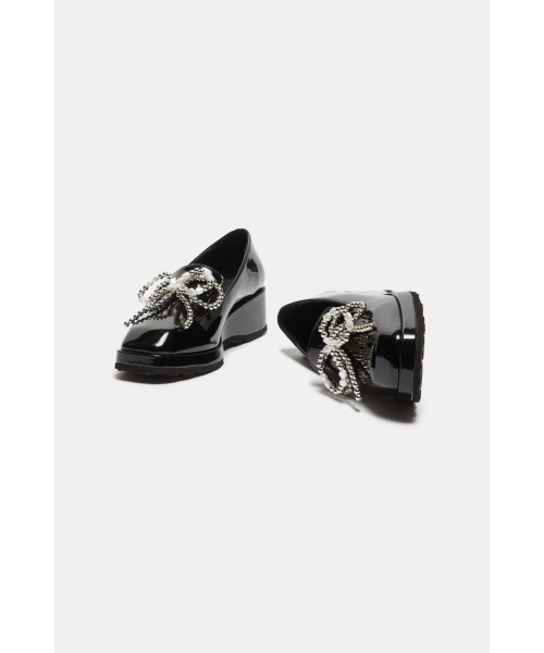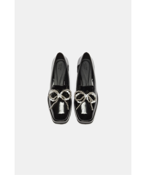 - 광택감 있는 블랙 로퍼에 큐빅 리본 장식을 더해
