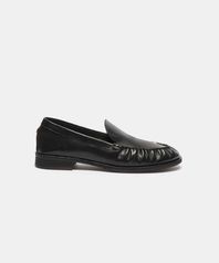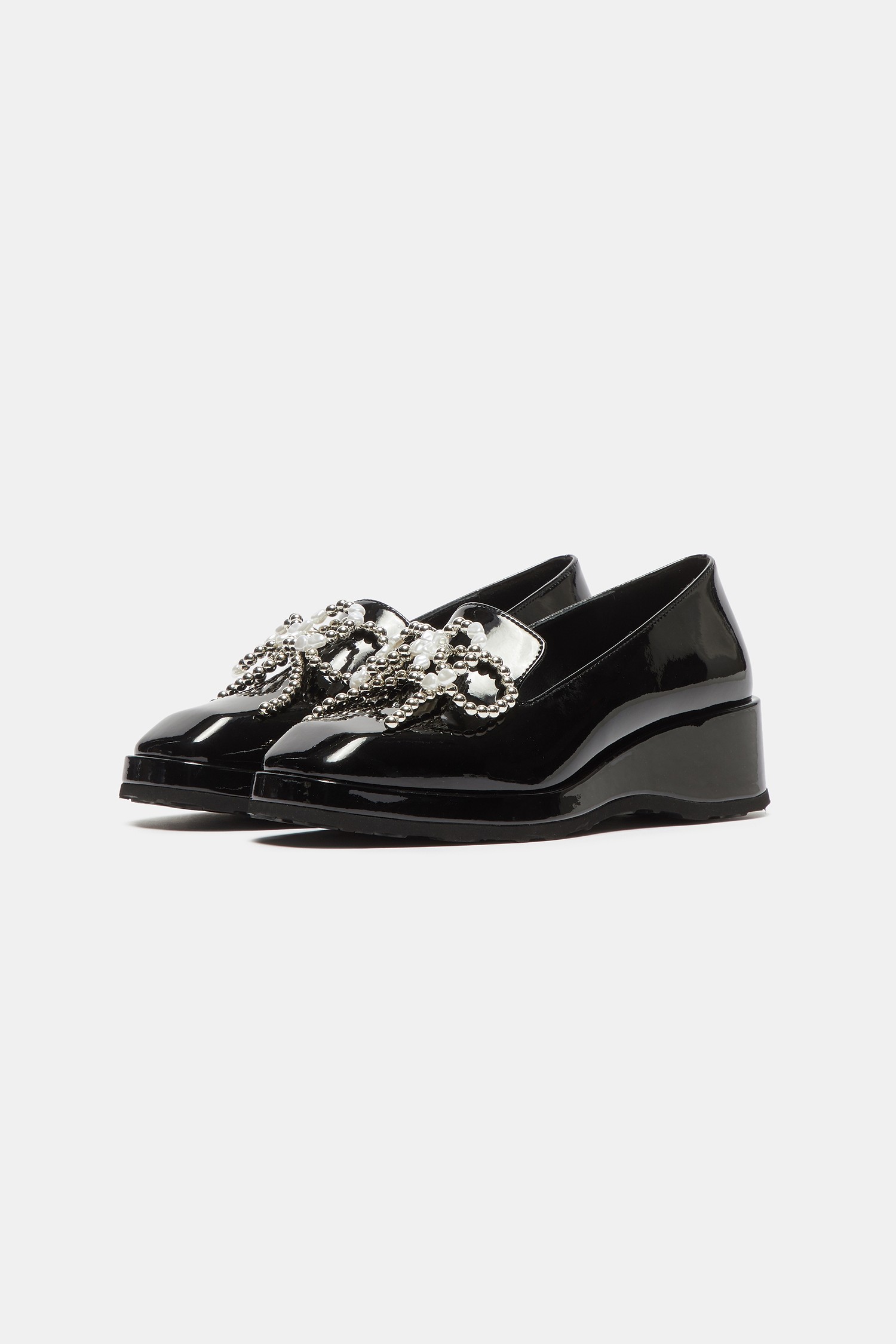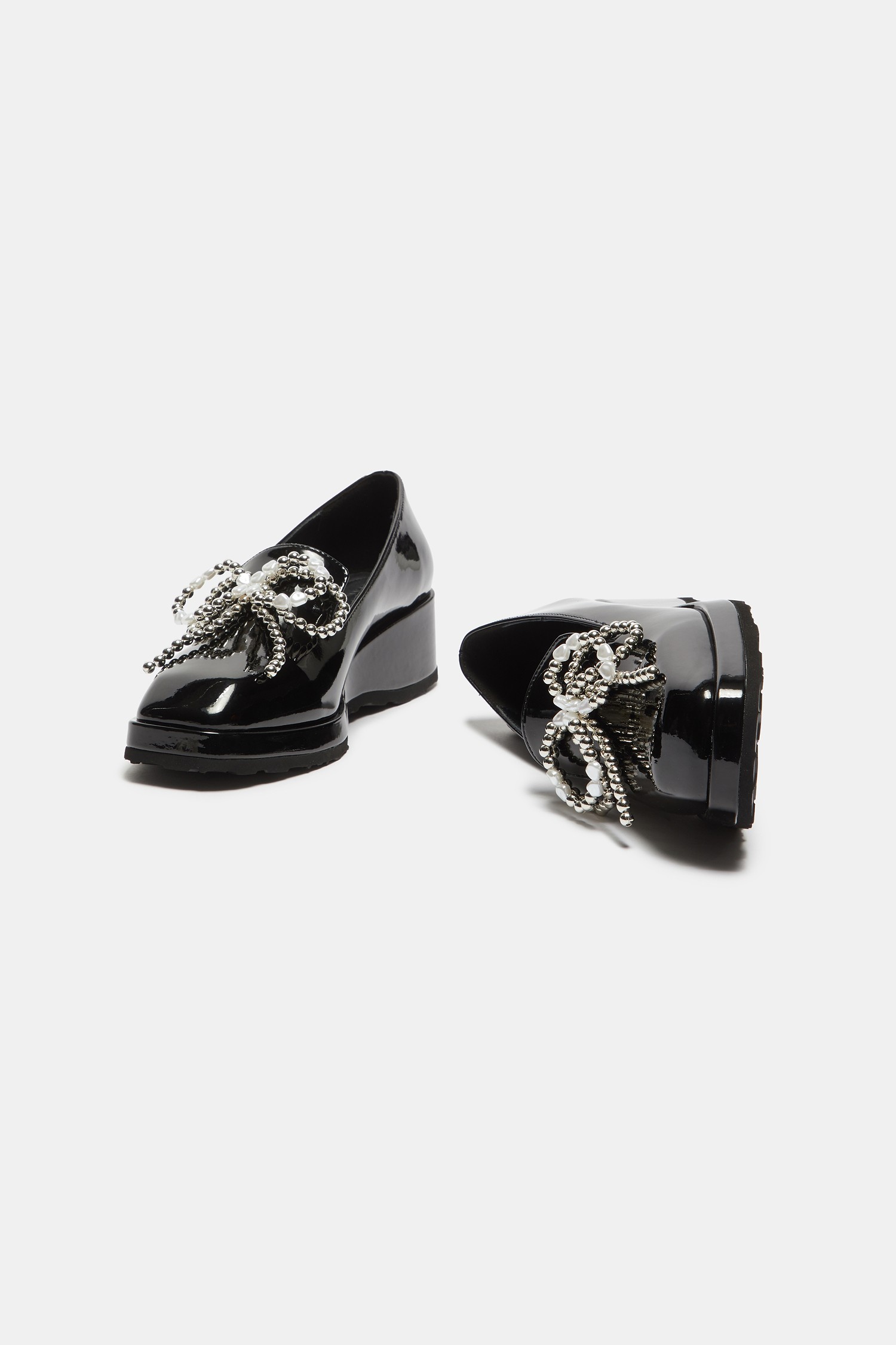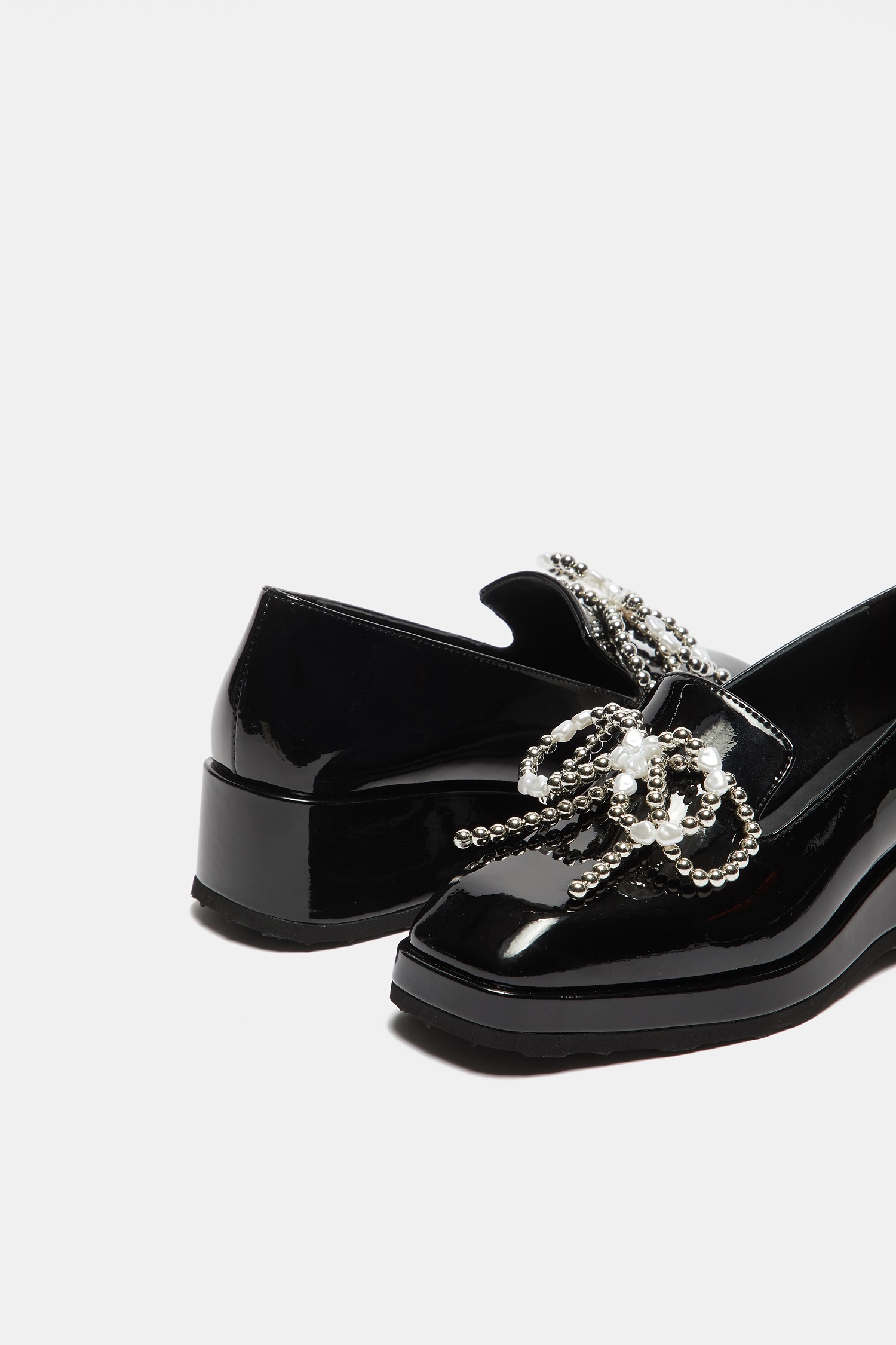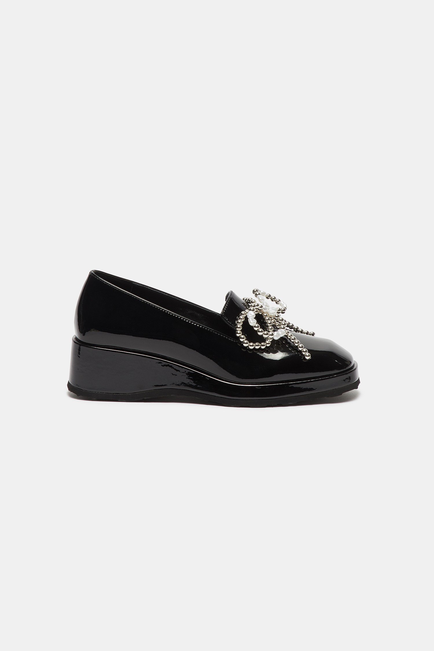 - 광택감 있는 블랙 로퍼에 큐빅 리본 장식을 더해