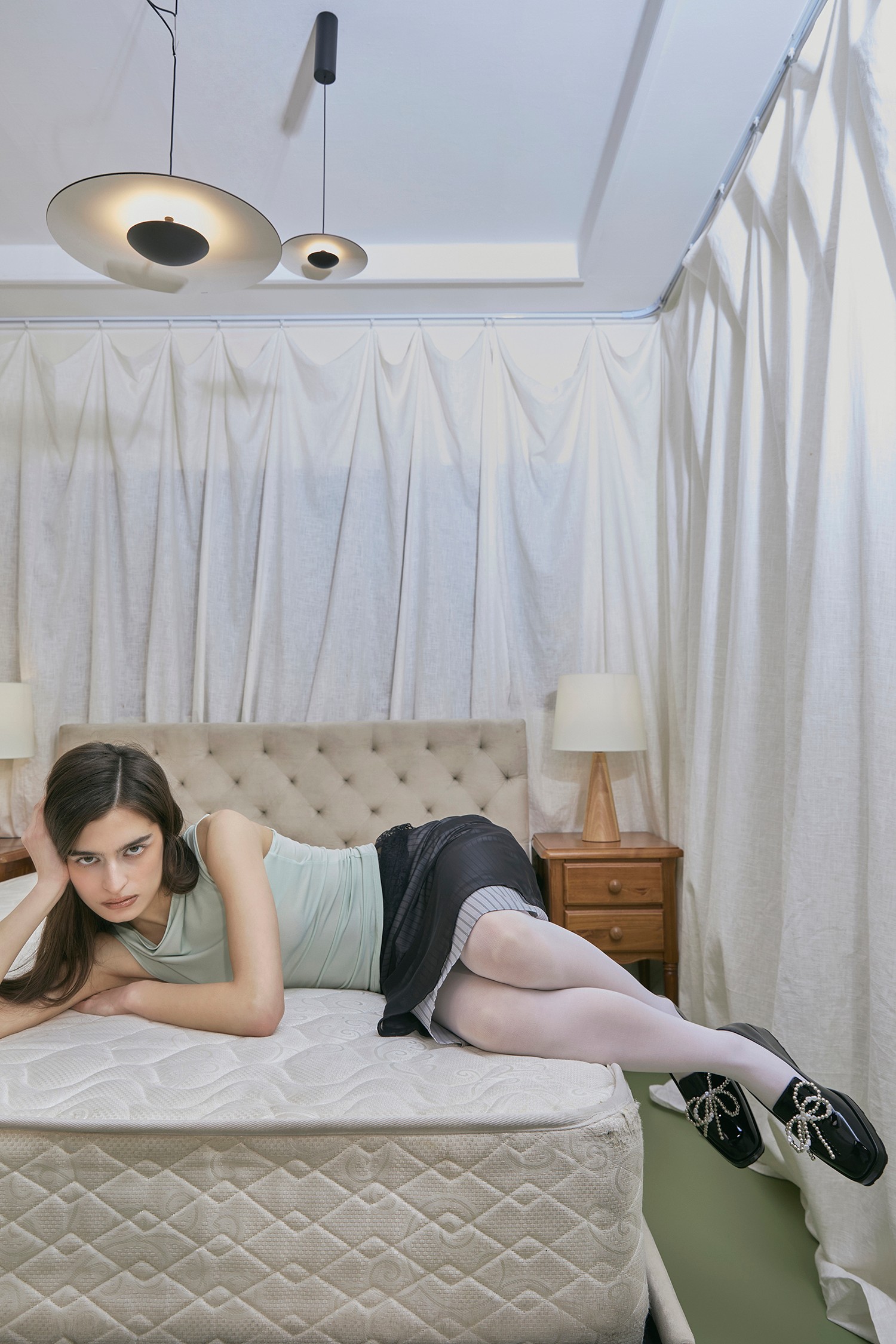 모노톤 룩에는 반짝이는 디테일로 정돈된 포인트.