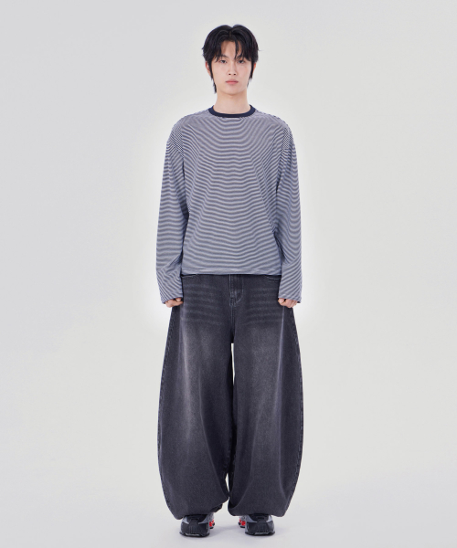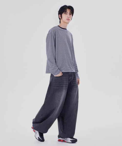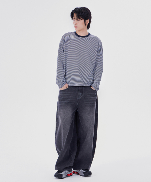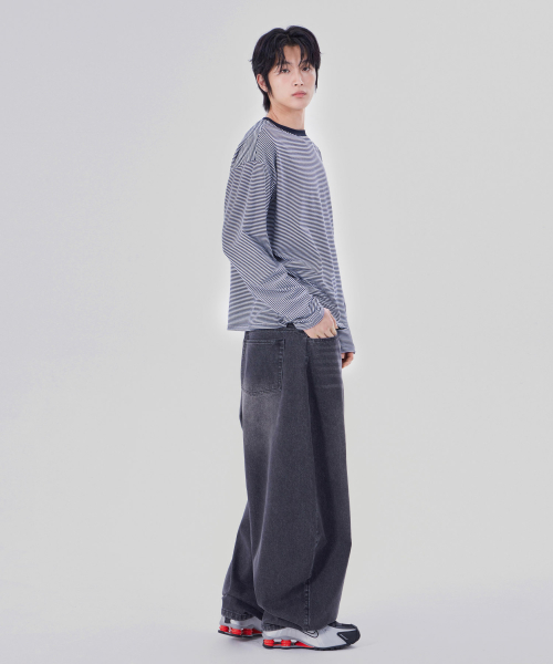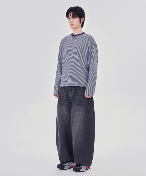 오버핏 스트라이프 코튼 롱슬리브 블랙