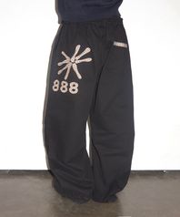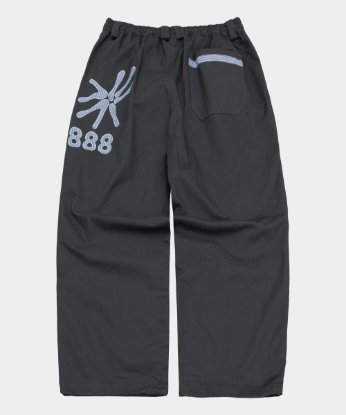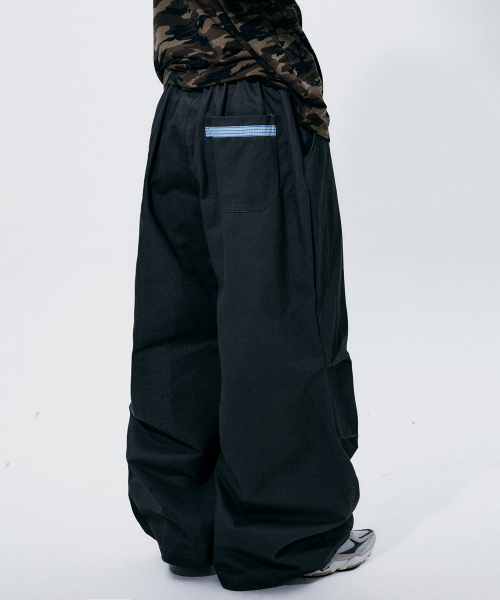 체크 웨이스트 레이어드 패치 포인트 와이드 트레이닝 코튼 팬츠 [블랙]