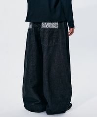 페이즐리 반다나 배색 포켓 포인트 와이드핏 데님 팬츠 [흑청]