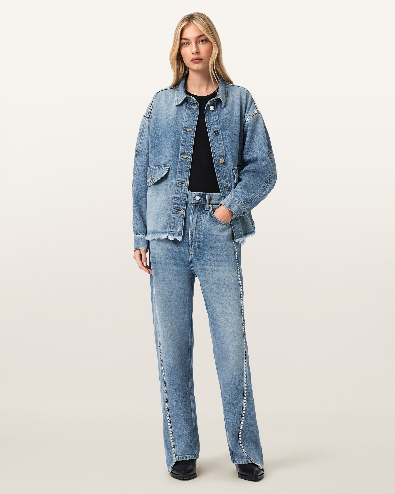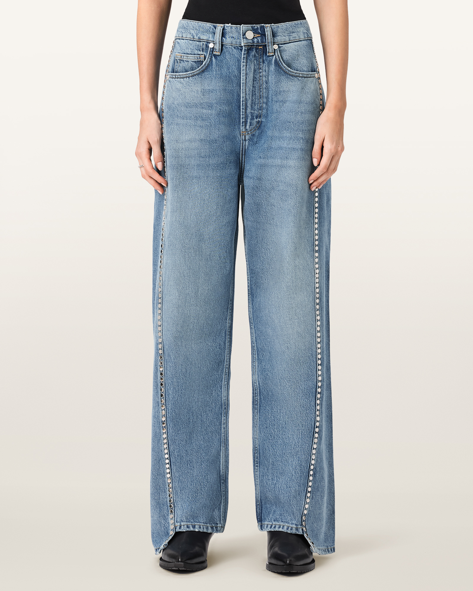 면 혼방 소재로 제작되었으며 솔기 라인을 따라 더해진 스터드 디테일이 강렬한 포인트를 더합니다. 스트레이트 핏 실루엣으로 다리 라인을 자연스럽게 정리해 주며, 반항적인 무드가 돋보이는 스타일입니다.