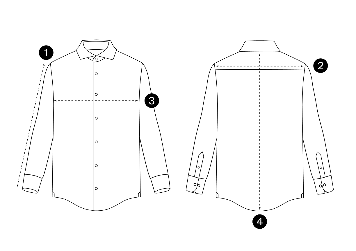 1 소매길이 소매가 시작되는 어깨선에서 소매 아래까지 측정합니다. 2 어깨 너비 의류의 어깨 왼쪽 상단부에서 오른쪽 상단부까지의 치수 3 가슴 암홀 높이에서 한쪽 끝부터 다른 쪽 끝까지 측정합니다. 4 길이 의류의 최상단에서 하단까지 측정합니다. |