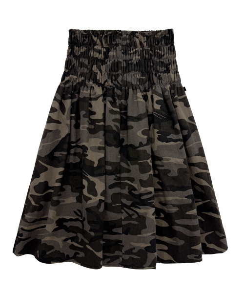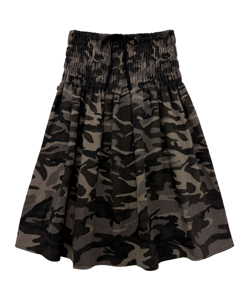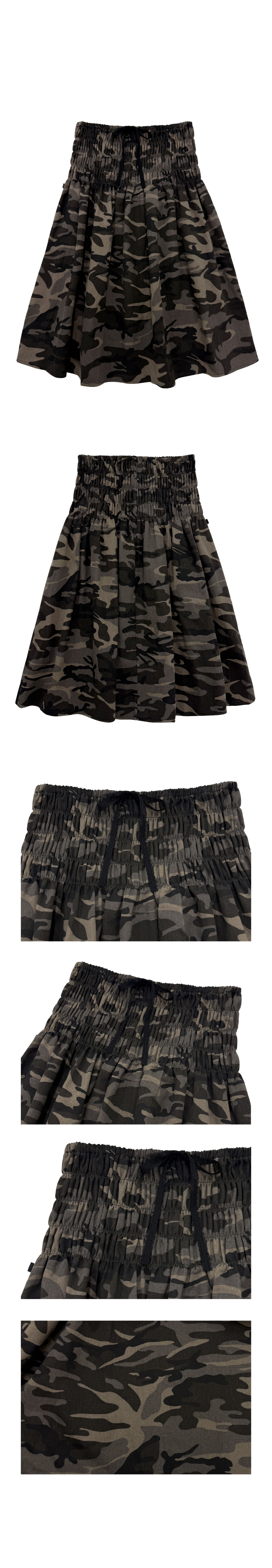 스모크밴딩 미디 스커트. 카모 패턴에 스모크밴딩과 레이스리본을 가미.