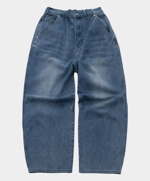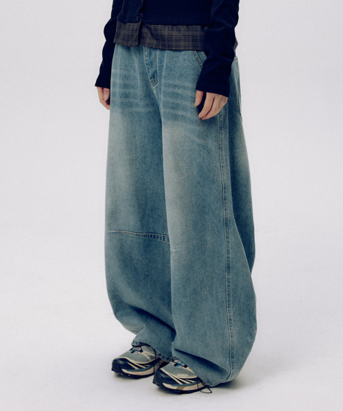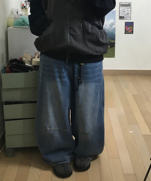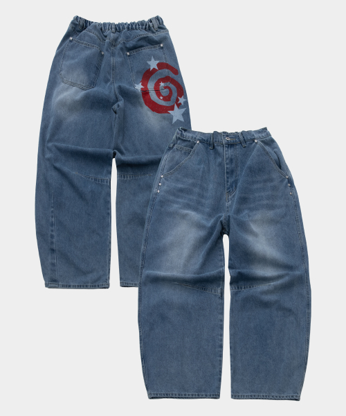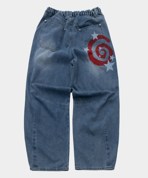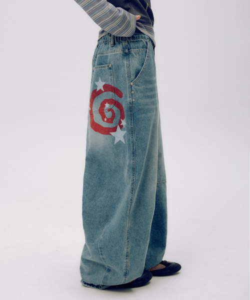 스팽글 스타 그래픽 내추럴 워시드 벌룬 와이드핏 데님 팬츠 [연청]