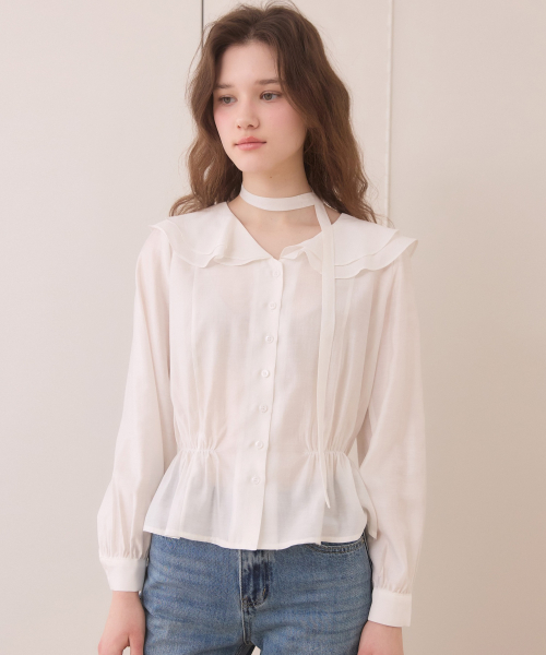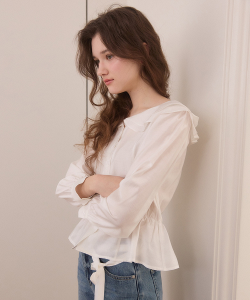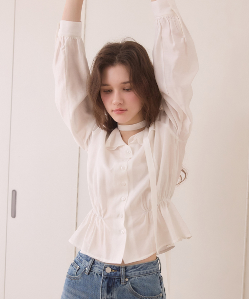 Duffle shirring ruffle tie blouse - white