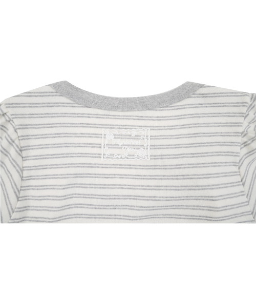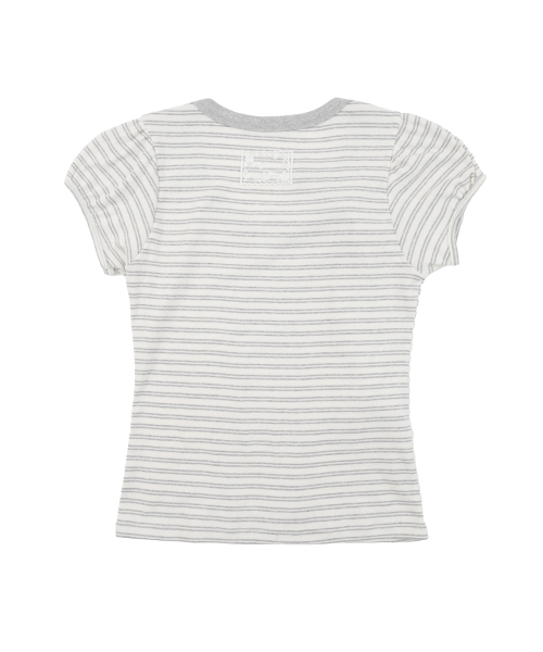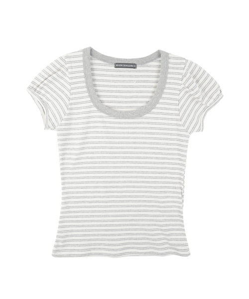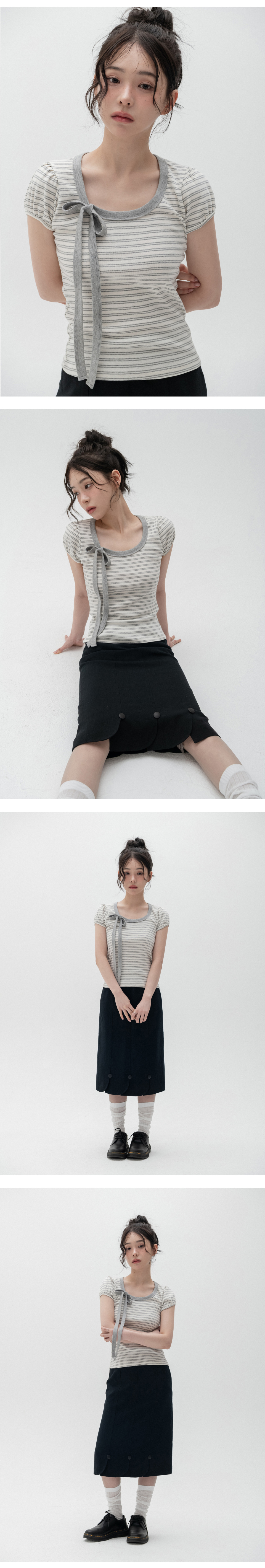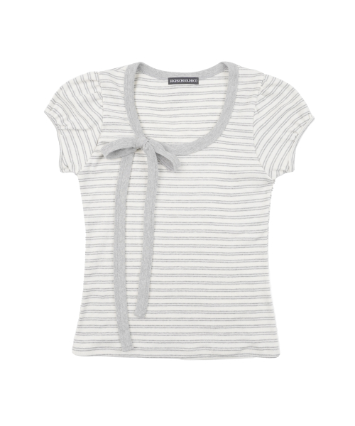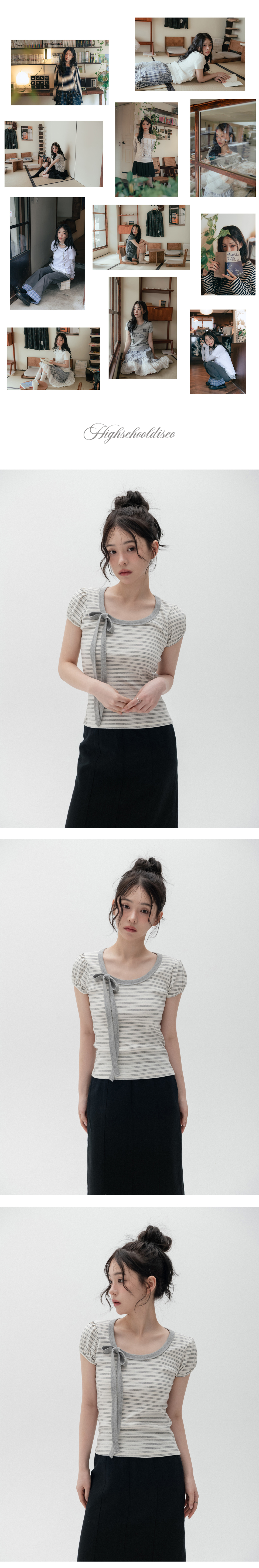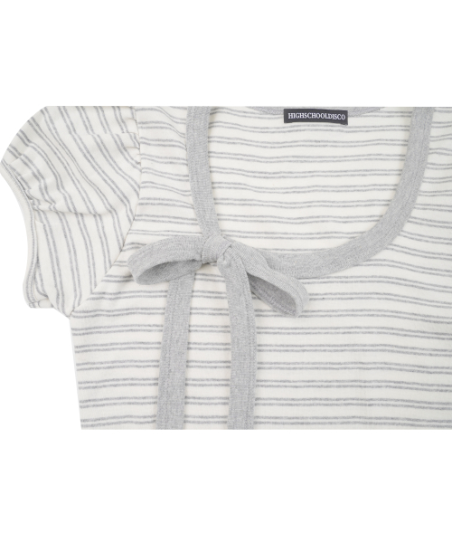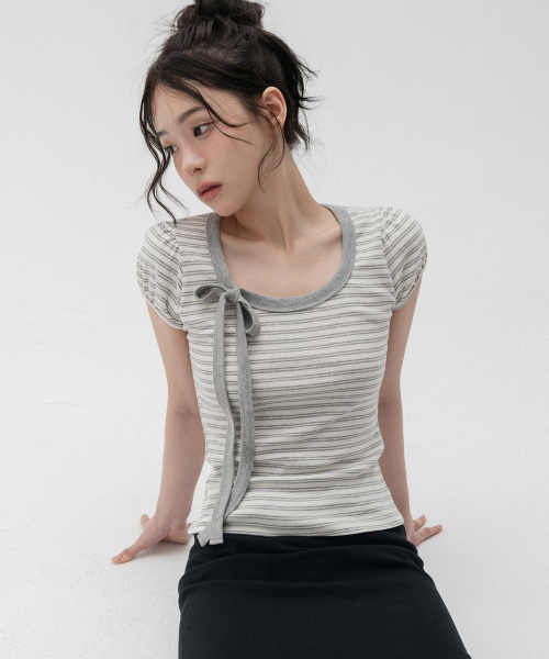 스트라이프 리본 퍼프소매 숏슬리브_메란지그레이