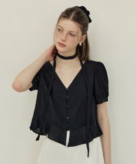 Sheer tie deep v neck blouse - black