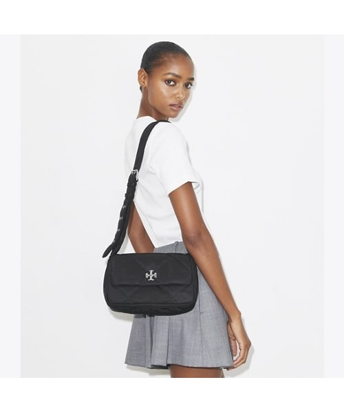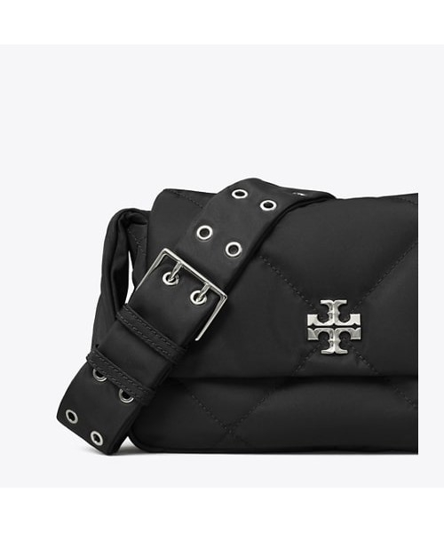 토리버치의 시그니처 더블 T 하드웨어가 돋보이는 키라 다이아몬드 퀼트 나일론 메신저 백입니다. 더 나은 환경을 위해 개발된 recycled nylon 소재로 제작되었으며, 길이를 조정할 수 있는 스트랩과 가방 내부 포켓으로 실용성을 더했습니다.