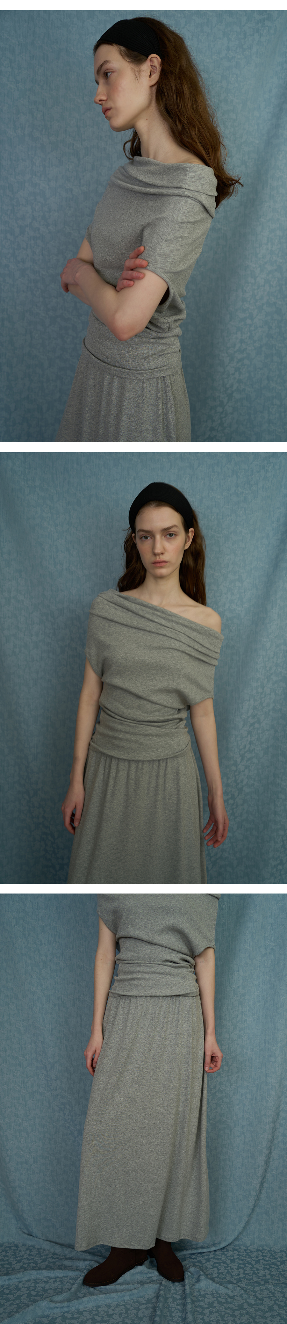 과하지 않은 오프숄더 디자인으로 여리여리한 무드를 연출하며, 스커트부터 팬츠까지 폭넓게 매치할 수 있습니다.