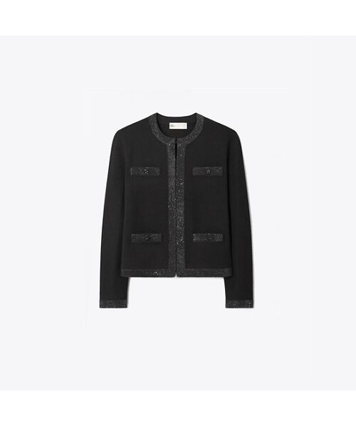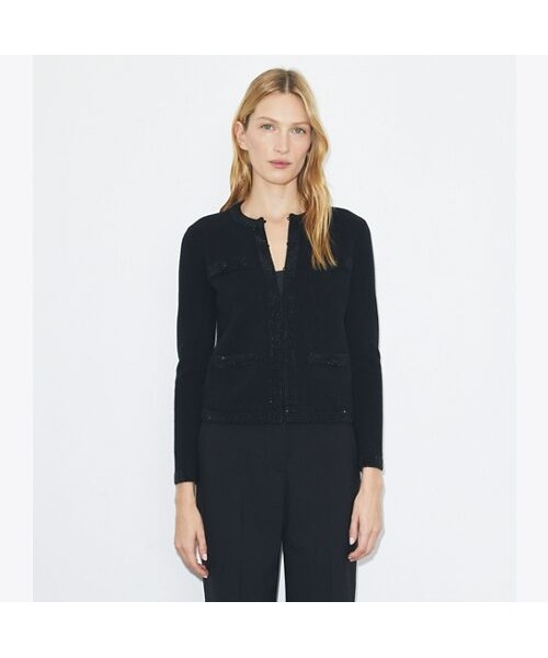 넥라인부터 가운데 여밈 부분까지 이어지는 임벨리시드 디테일이 특징인 켄드라 카디건입니다. 블랙 울 소재에 톤온톤으로 더해진 장식이 고급스러운 무드를 자아내며 스타일링에 따라 다양한 분위기로 연출할 수 있는 아이템입니다.