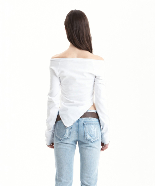 - 넥라인 조절이 가능한 스트링 디자인과 비대칭 컷팅 밑단이 포인트인 롱슬리브