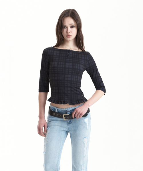 - 빈티지한 체크 원단에 밑단 프릴 디테일을 더한 7부 기장의 롱슬리브