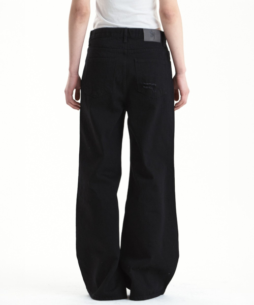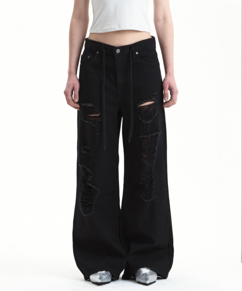 - 빈티지한 데미지 디테일과 스트링 포인트가 돋보이는 와이드 데님 팬츠