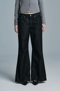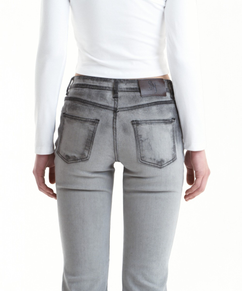 - 그라데이션 워싱과 무릎 데미지 디테일의 로우 웨이스트 부츠컷 데님 팬츠