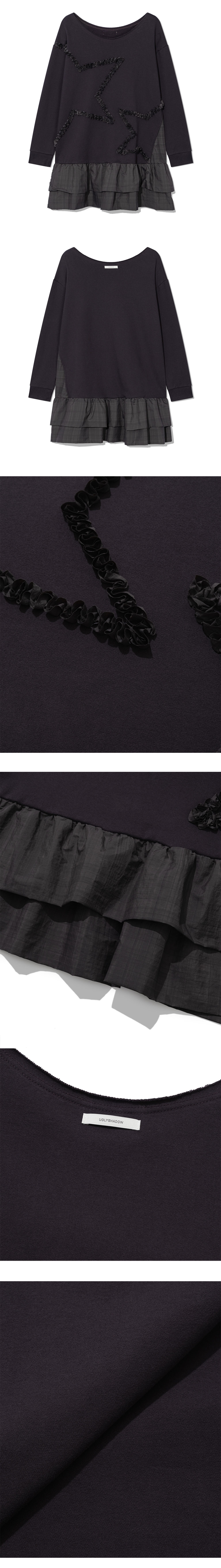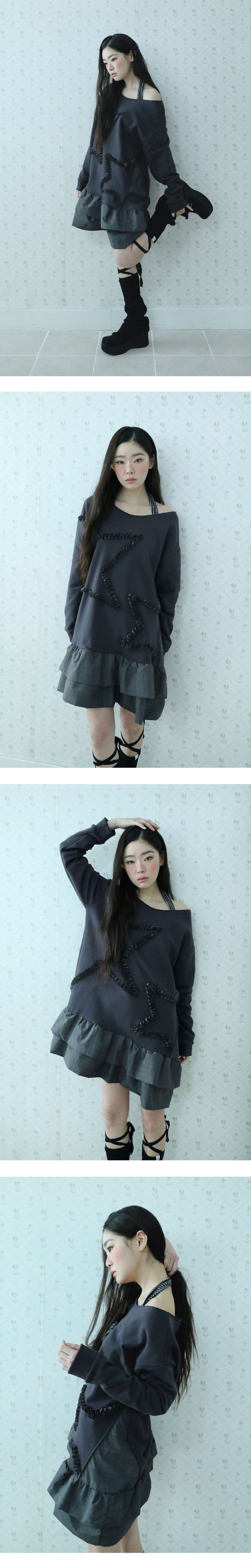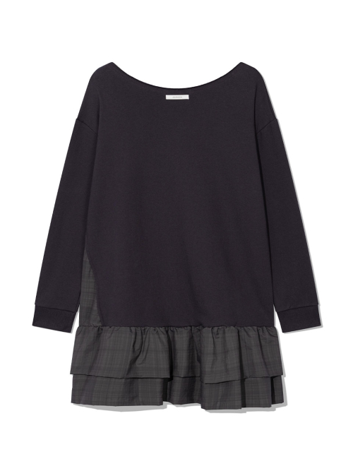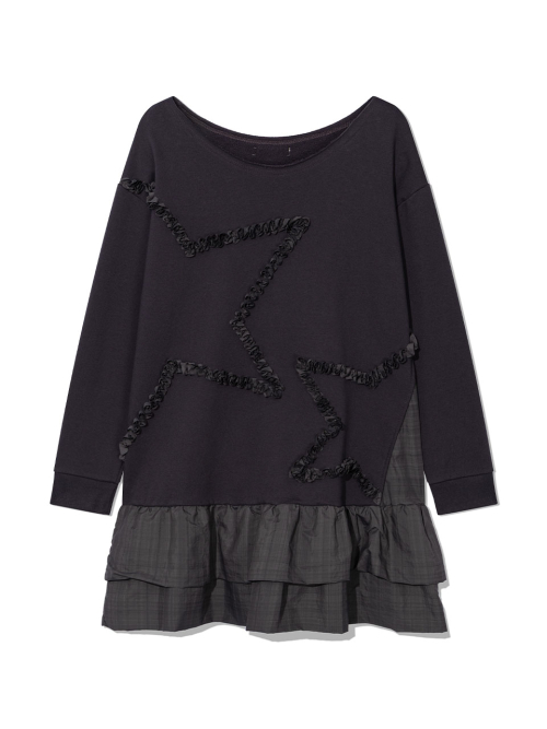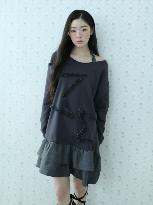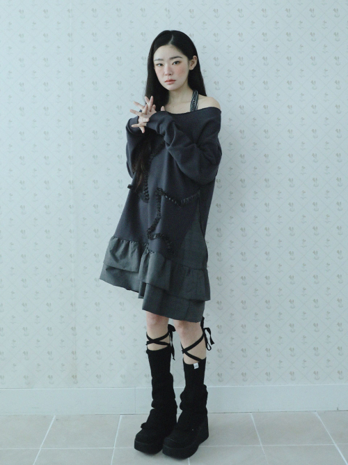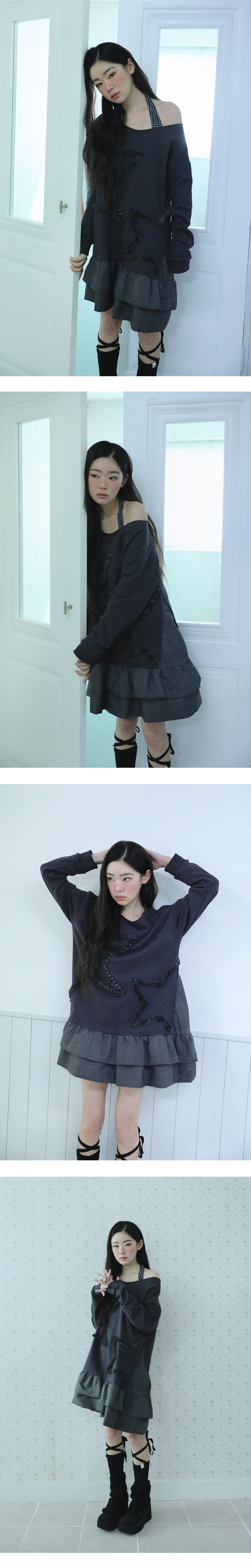 밑단의 체크 프릴과 별 모양으로 잡힌 주름 디테일이 돋보이는 오프숄더 드레스입니다.