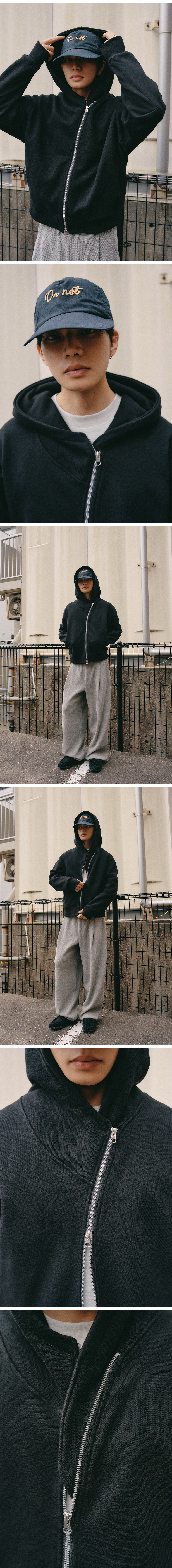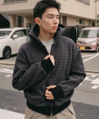 스트라이프 코어 크롭 핑거 홀 후드 집업 [차콜]
