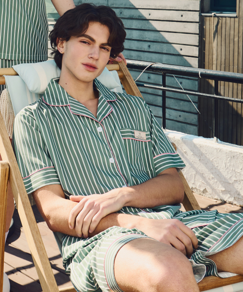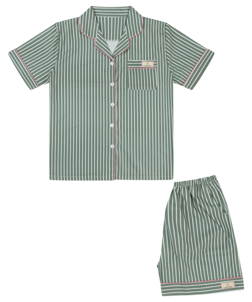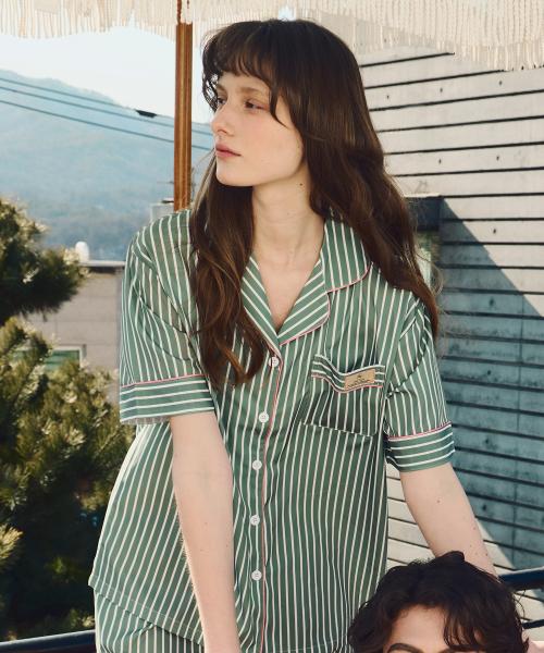[2pack] (uni) 소프트필 스트라이프 올리바인 반팔 카라 잠옷 세트