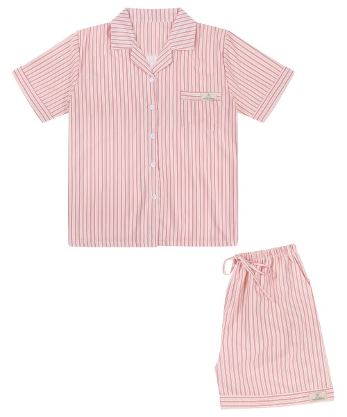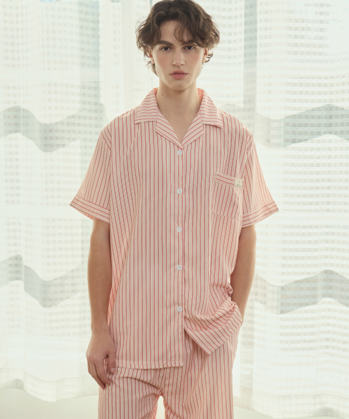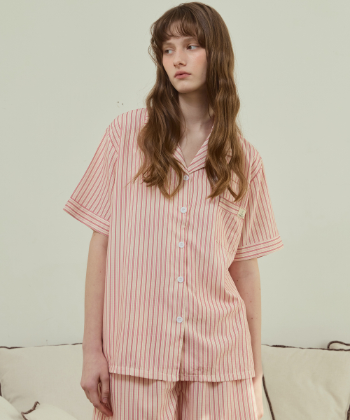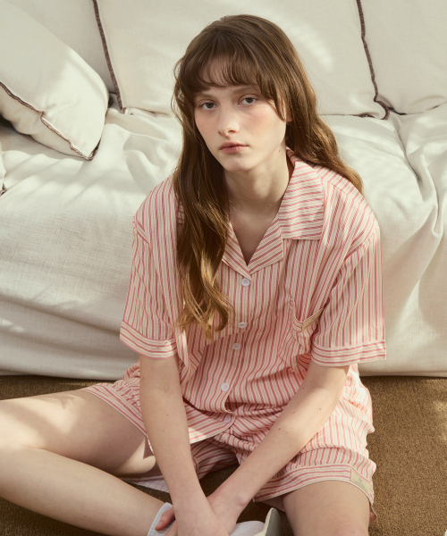 버터옐로 스트라이프 반팔 카라 투피스 잠옷 세트