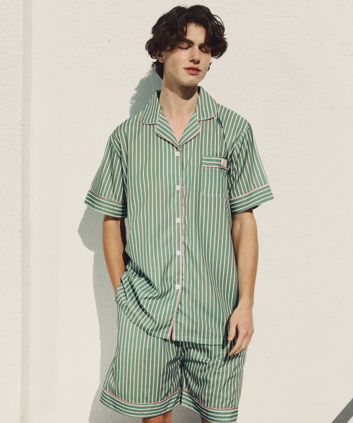 (uni) 소프트필 스트라이프 올리바인 반팔 카라 잠옷 세트