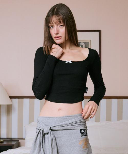 스모크 셔링 스쿱넥 롱슬리브 탑 BLACK