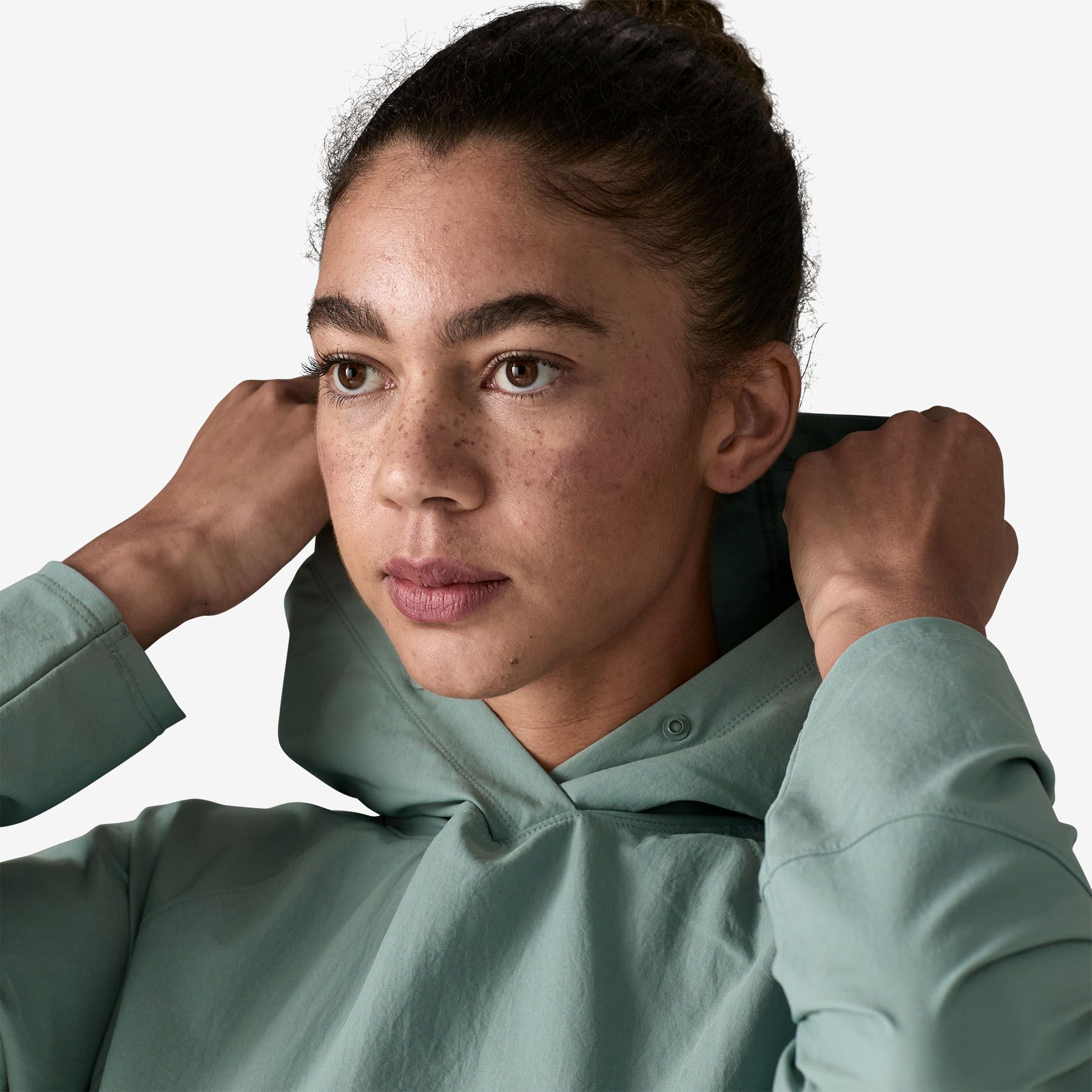 우먼즈 스위프트 드리프트 선 후디는 착용감이 편안한 릴랙스 핏의 기능성 후드티로, 자외선 차단 지수가 40+ UPF 입니다. 신축성과 속건성이 좋은 가벼운 리사이클 원단을 사용하였습니다. 지퍼가 달린 캥거루 주머니, 머리 전체를 감싸 주는 후드, 신축성이 좋은 손가락 고리, 내마모성이 강한 하드웨어로 구성되어 있습니다.